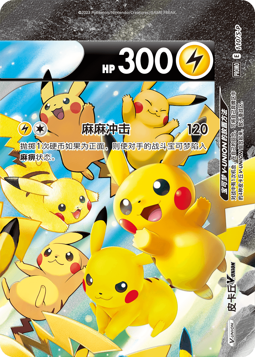 皮卡丘V-UNION不但插图可爱,在对局中也十分强力。“麻麻冲击”和“电磁干扰”均可使对手手足无措,是让对手陷入麻痹无法动弹还是无法使用物品从而痛苦不堪都在你一念之间。你也可以使用“一同电球”给对手来一次“电击”,250点的伤害也是不容小觑。可爱的皮卡丘是你的忠实小伙伴,但对待敌人时它可是不会手下留情的喔。