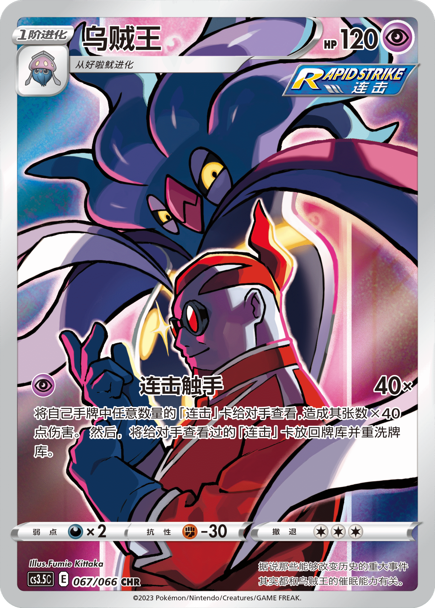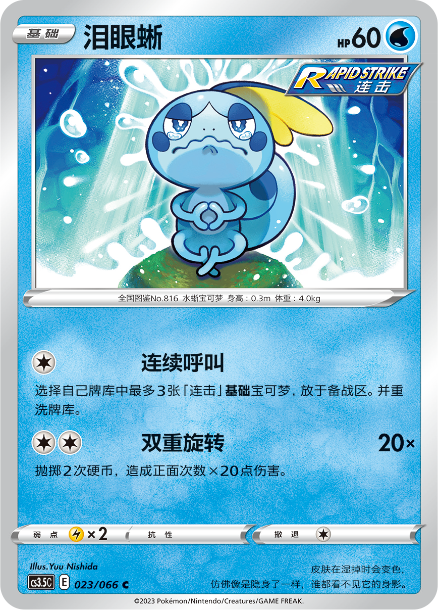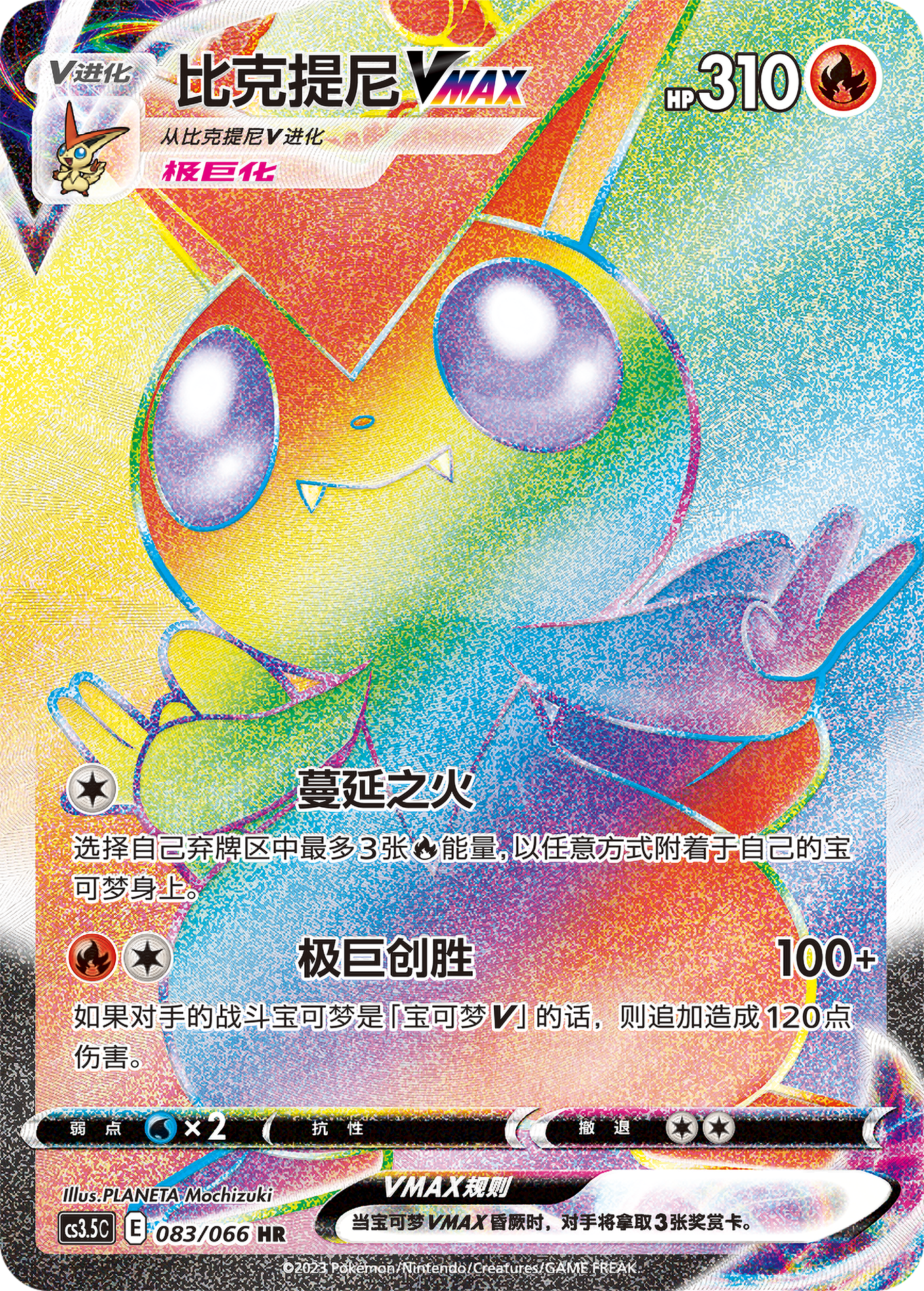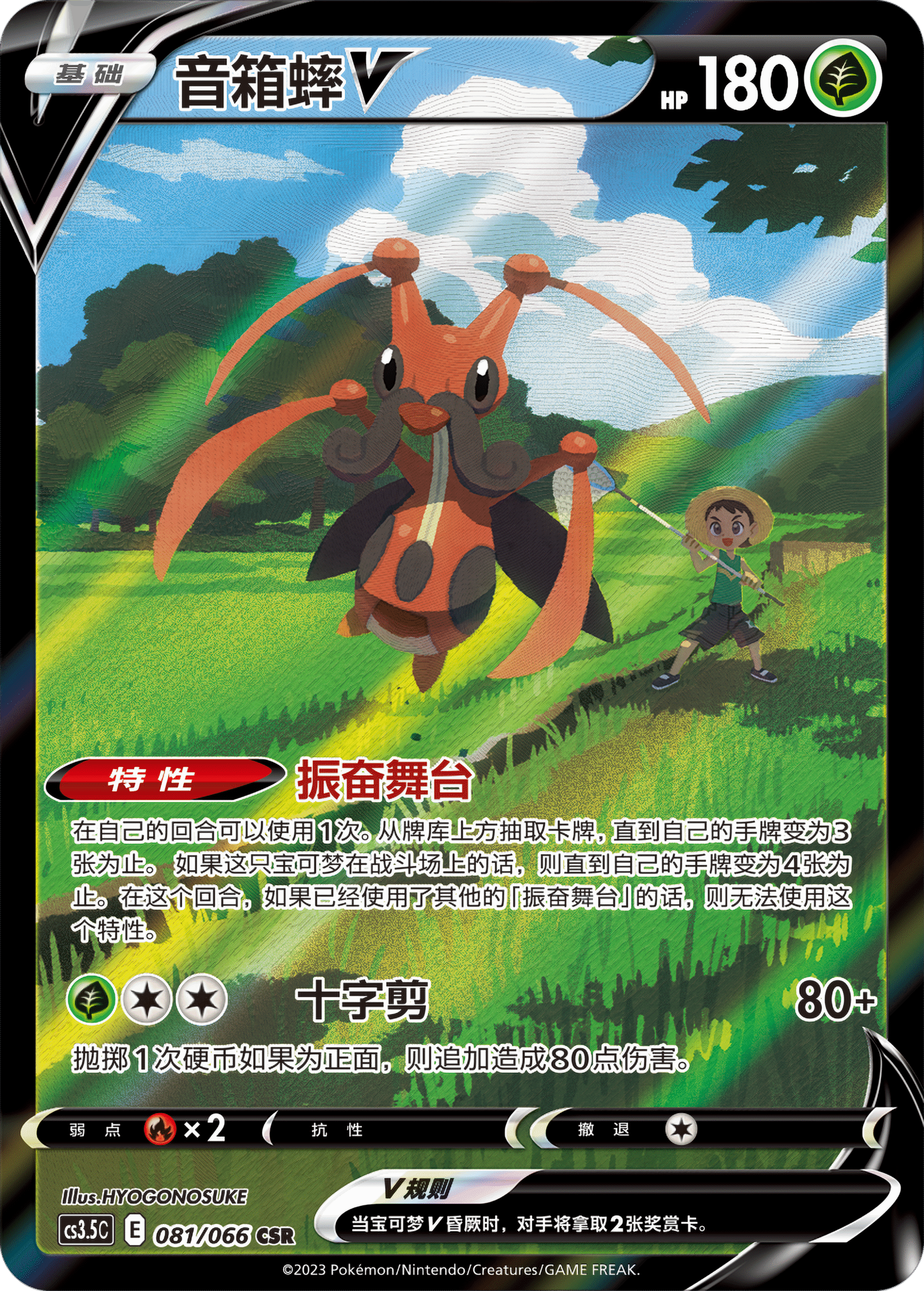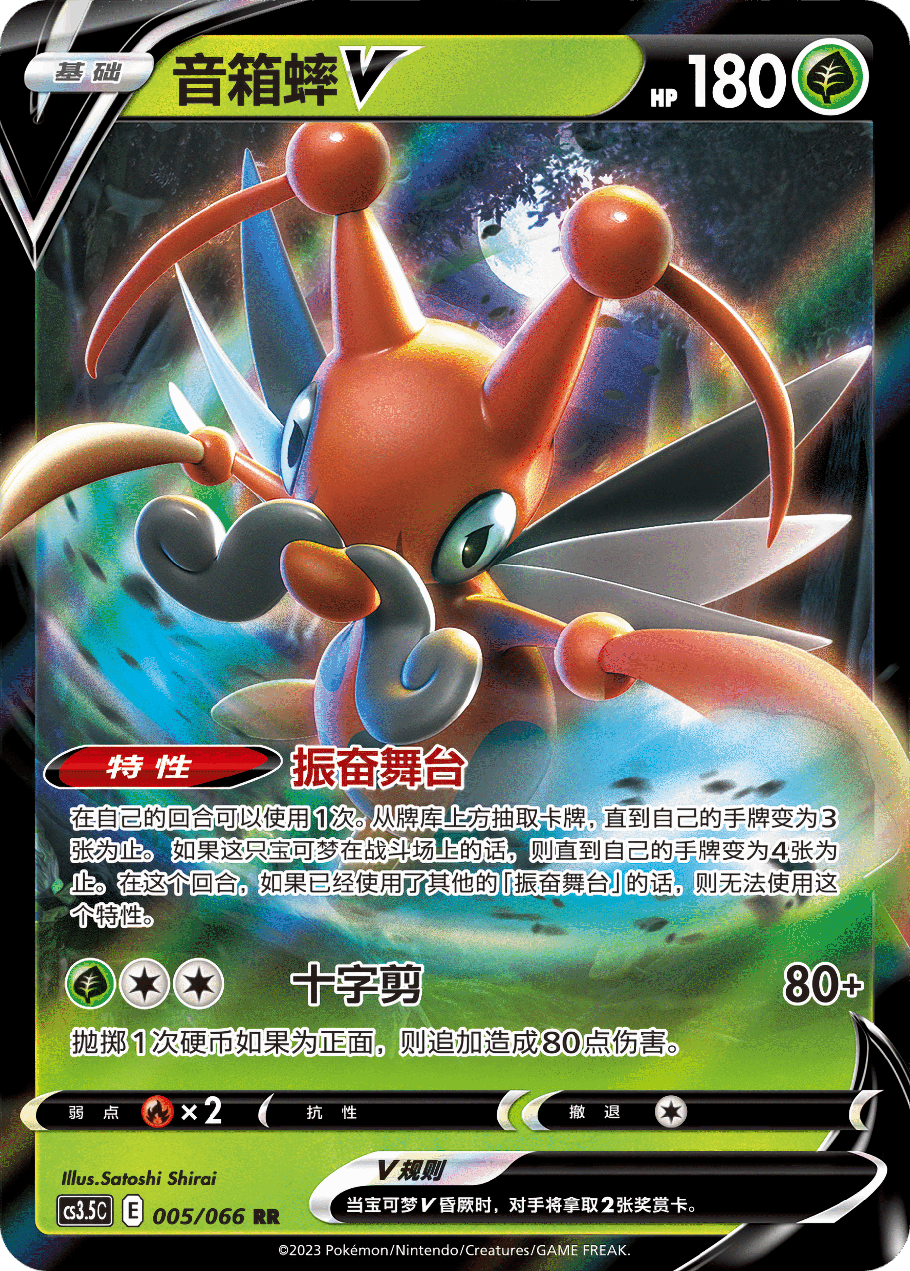 同时音箱蟀V还拥有攻击招式“十字剪”,1个基本草属性能量+2个任意属性能量便可使用。该招式的伤害为80点,但可通过抛掷一次硬币来追加伤害。最多共能造成80加80,也就是160点的高额伤害。需要音箱蟀V来进攻时,勇敢地掷出硬币吧,运气也是实力的一部分!