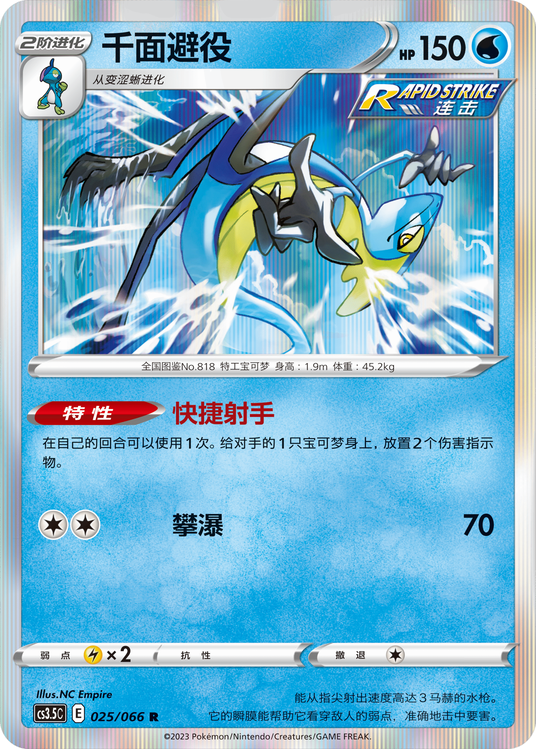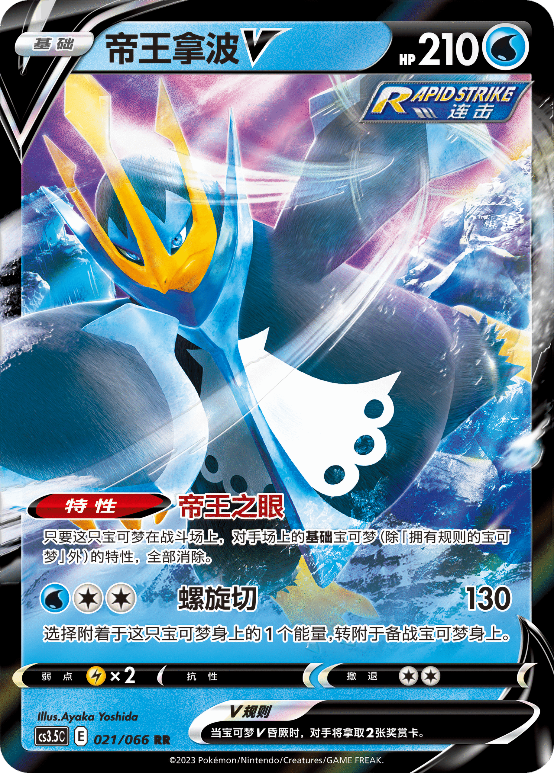 只要帝王拿波V在战斗场,对手的基础宝可梦(拥有规则的宝可梦除外)的特性均将失效。打破对手的战略布局,一口气取得胜利吧!