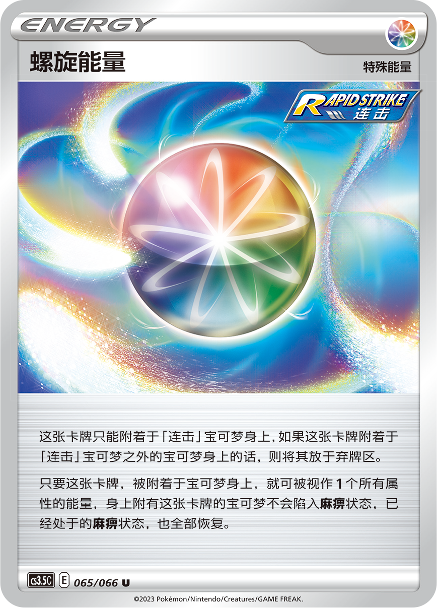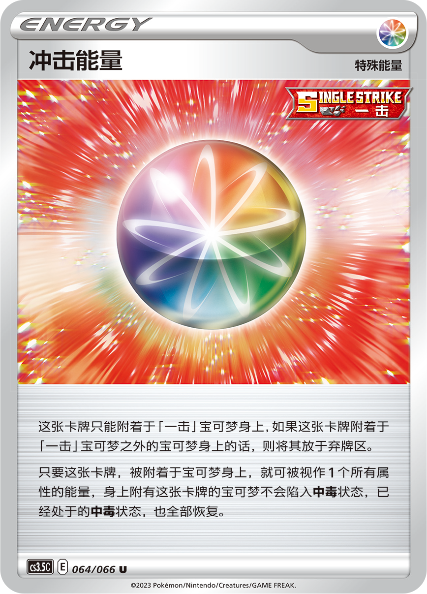 附着后不会陷入特定的特殊状态,且会被视为任意属性能量的冲击能量(对应“一击”宝可梦使用)和螺旋能量(对应“连击”宝可梦使用)