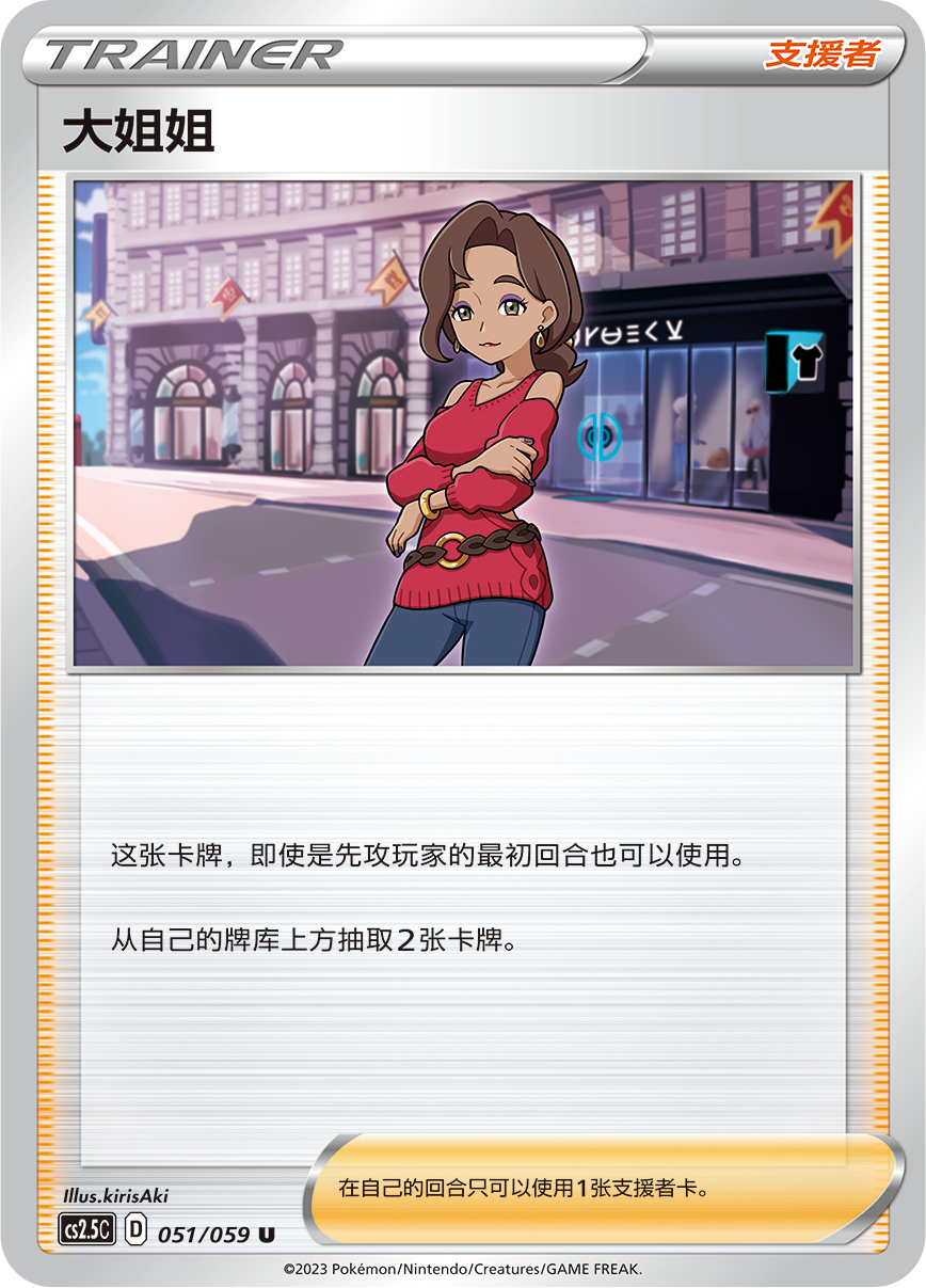 支援者卡“大姐姐”在先攻的回合也能使用,让训练家在对战中抢尽先机。