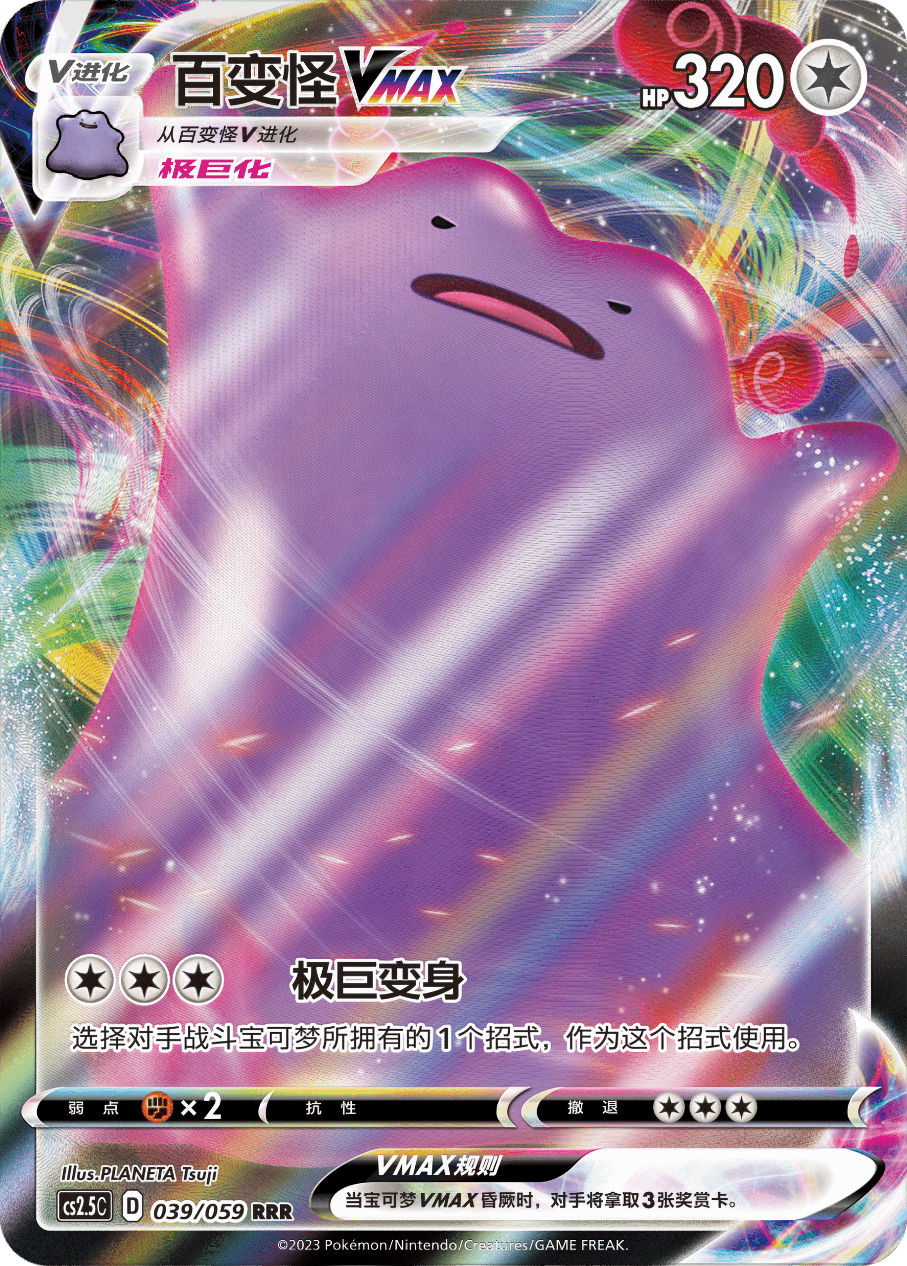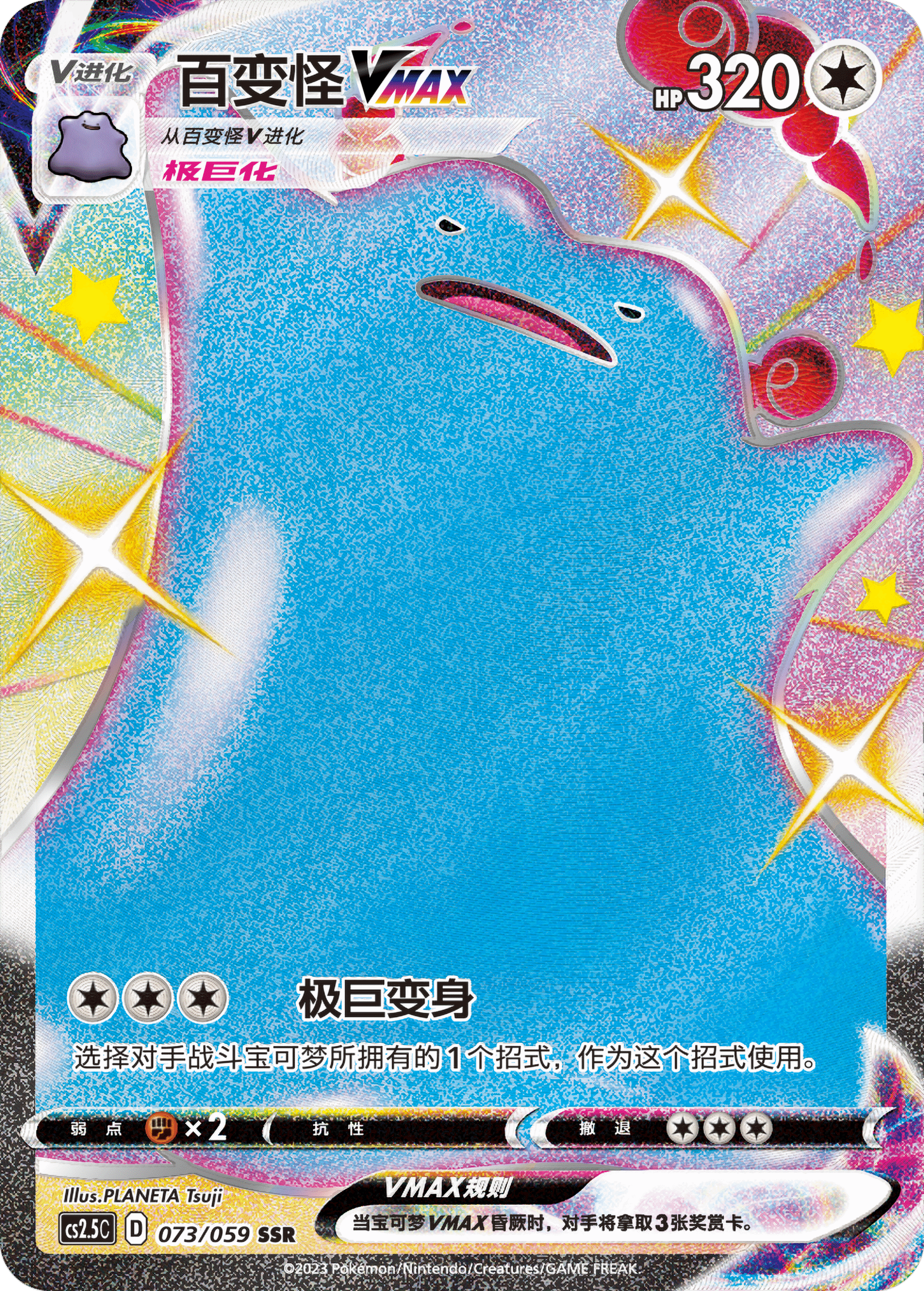 当然你也可以将它V进化!进化成百变怪VMAX后,320点的HP可抵挡对手绝大部分的强悍攻势,同时也可使出非常有趣的招式——“极巨变身”。在满足3个任意属性能量的前提下,可以随意使用对手战斗宝可梦的1个招式。“以彼之道还施彼身”,对手的宝可梦越厉害,你的攻击就会越强力!