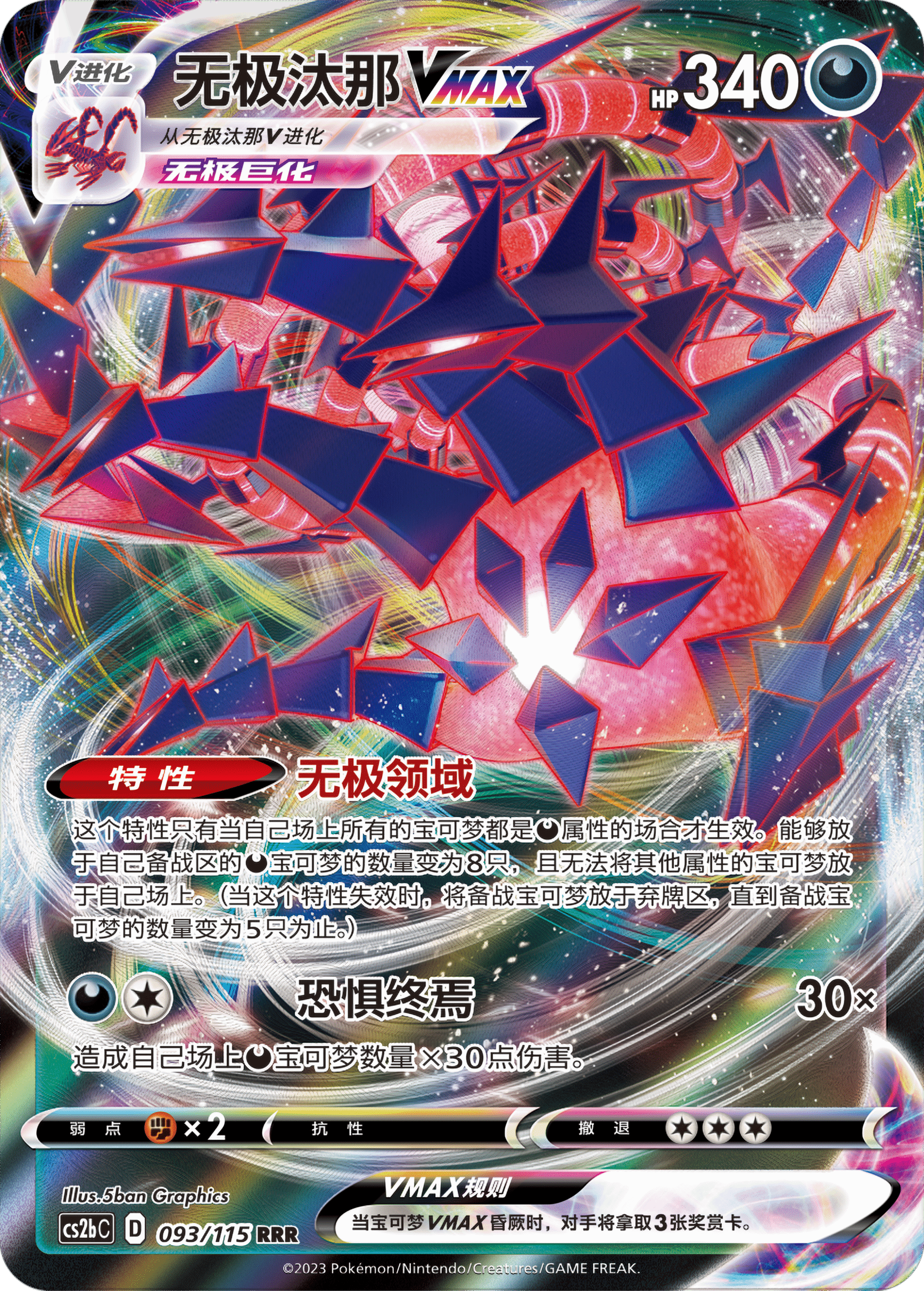 招式【恐惧终焉】能根据自己场上恶属性宝可梦的数量提升伤害,最高可造成30×9=270点伤害,而伤害如此高的招式居然仅需1个恶属性能量和一个无属性能量便能使用。前期尽可能在备战区放满8只宝可梦,再用【恐惧终焉】终结对手,充分发挥无极汰那VMAX的独特机制,构思一套属于你自己的常胜卡组吧。