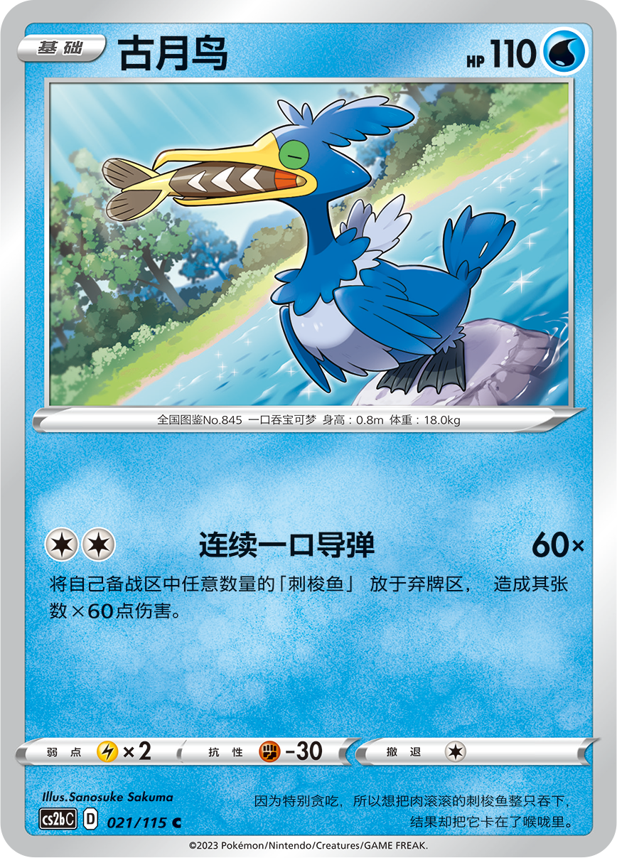 补充包【浓墨重彩 靛】中收录的古月鸟是一张非常有趣的卡牌,能通过将自己备战区里的刺梭鱼放于弃牌区来提升其招式【连续一口导弹】的伤害。作为一只基础宝可梦,古月鸟只需2个无属性能量便能造成最高240点的夸张的伤害,利用【连续一口导弹】在战场上“刺穿”一切吧!