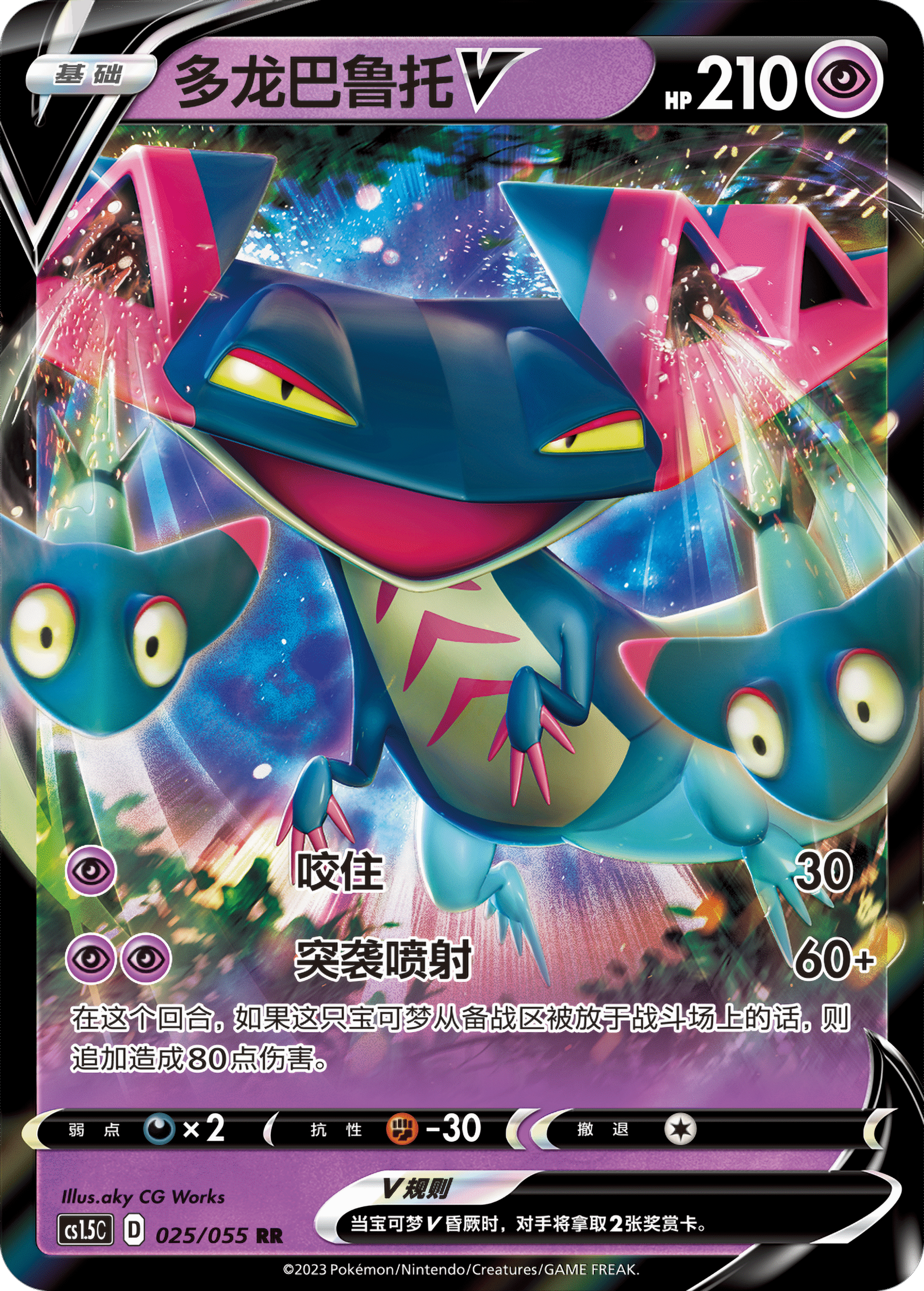 当多龙巴鲁托V从备战区被放于战斗场时,招式【突袭喷射】能造成合计140点的伤害,仅需要2个超属性能量便可使用,是一个简单又实用的招式。