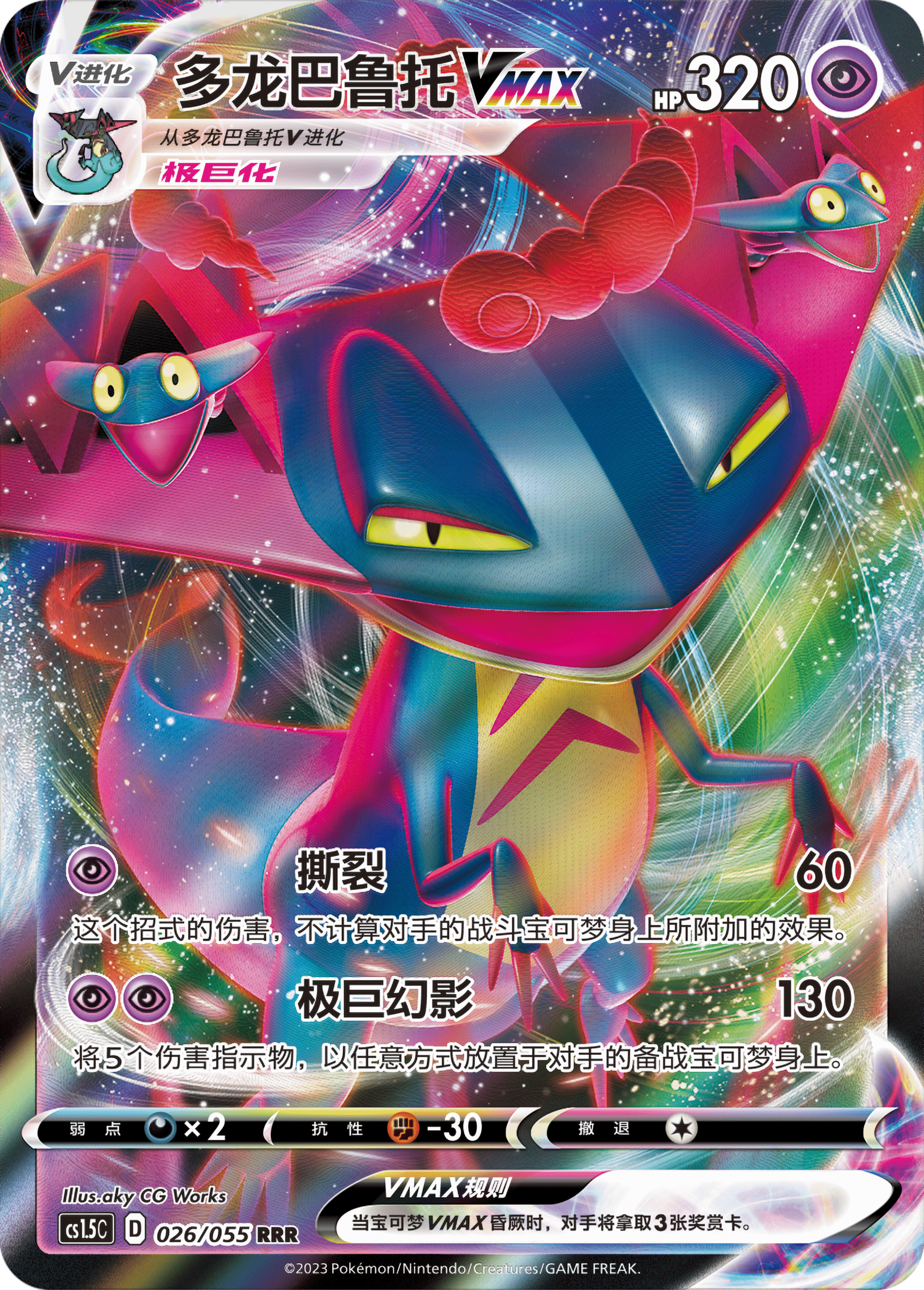 在进化为多龙巴鲁托VMAX后,新招式【极巨幻影】能为你的对战带来不一样的新玩法。【极巨幻影】也仅需2个超属性能量,可快速发动攻势。除了能对对手的战斗宝可梦造成130点伤害之外,还可将5个伤害指示物,以“任意方式”放置于对手的备战宝可梦身上。可以利用该效果进行追击,对受伤后撤到备战区的对手宝可梦补上最后一击。通过精心计算将伤害指示物恰到好处地分配,运筹帷幄来获取对战胜利吧。