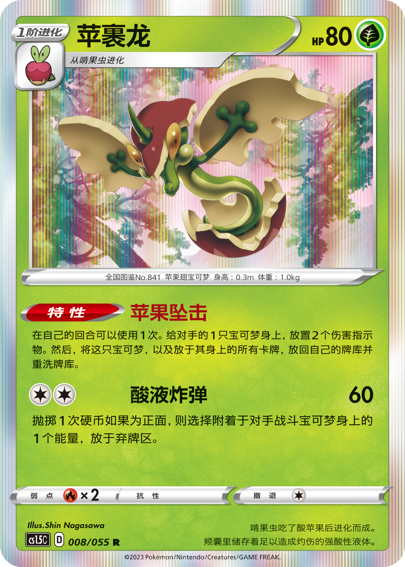 苹裹龙的特性【苹果坠击】可给对手任意1只宝可梦身上放置2个伤害指示物,配合【极巨幻影】可以更快地给对手的宝可梦累计伤害。使用特性后苹裹龙和放于其身上的所有卡牌都需放回牌库,你也可以通过草路竞技场等卡牌快速检索出苹裹龙来多次发动【苹果坠击】。