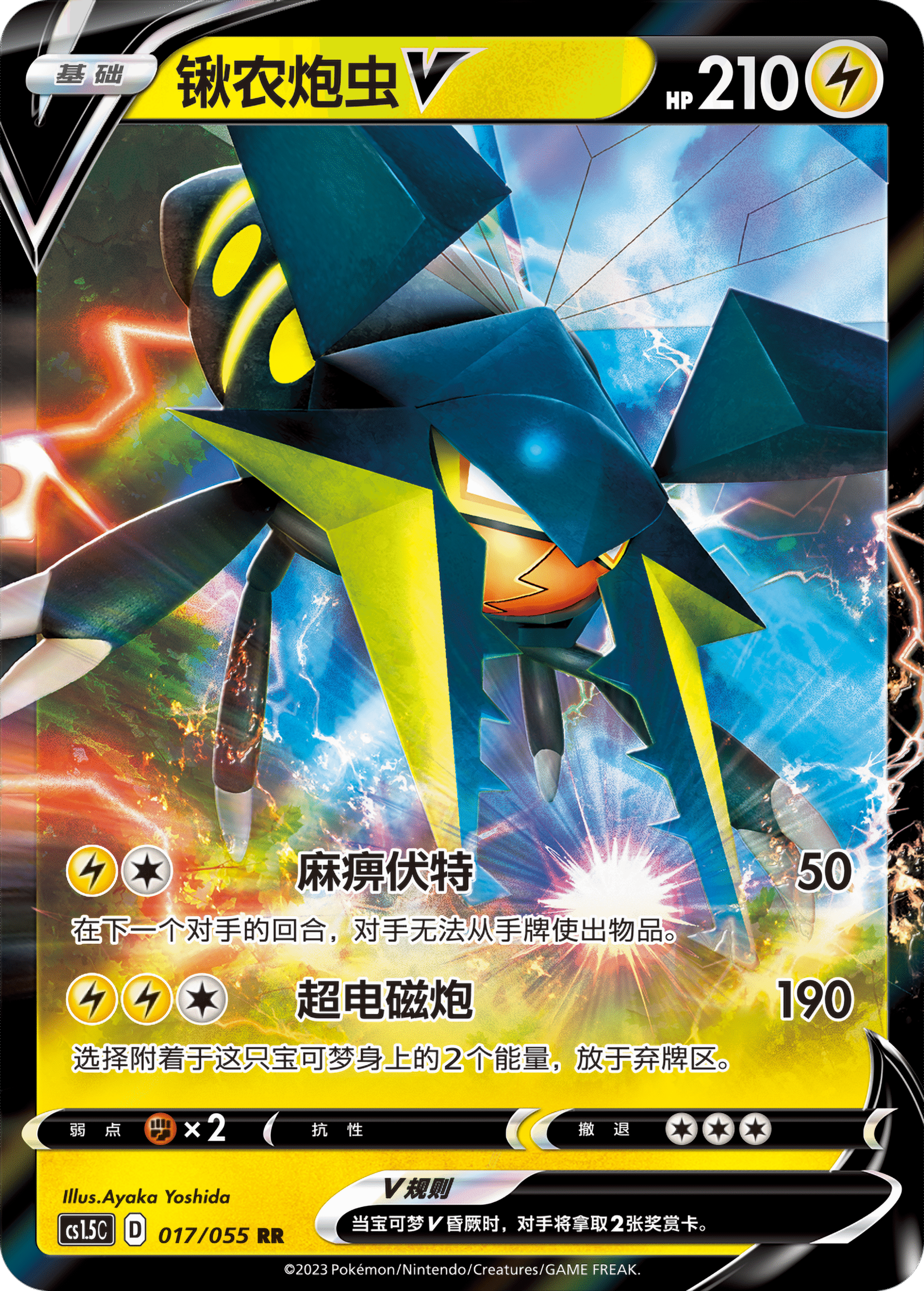 雷属性宝可梦锹农炮虫V可以给对手造成极大的干扰。1个雷属性能量+1个任意属性能量发动的【麻痹伏特】可造成50点伤害,同时还可使对手在下一个回合里无法从手牌中使用物品。宝可梦卡牌对战中的每一个回合都非常宝贵,即使只有一个回合无法使用物品也有可能导致败局。2个雷属性能量+1个任意属性能量发动的【超电磁炮】,使用后需要弃掉2个能量,但却能造成190点的高额伤害。配合电气能量管和活力头带等训练家卡可对对手的战斗宝可梦造成毁灭性打击。
