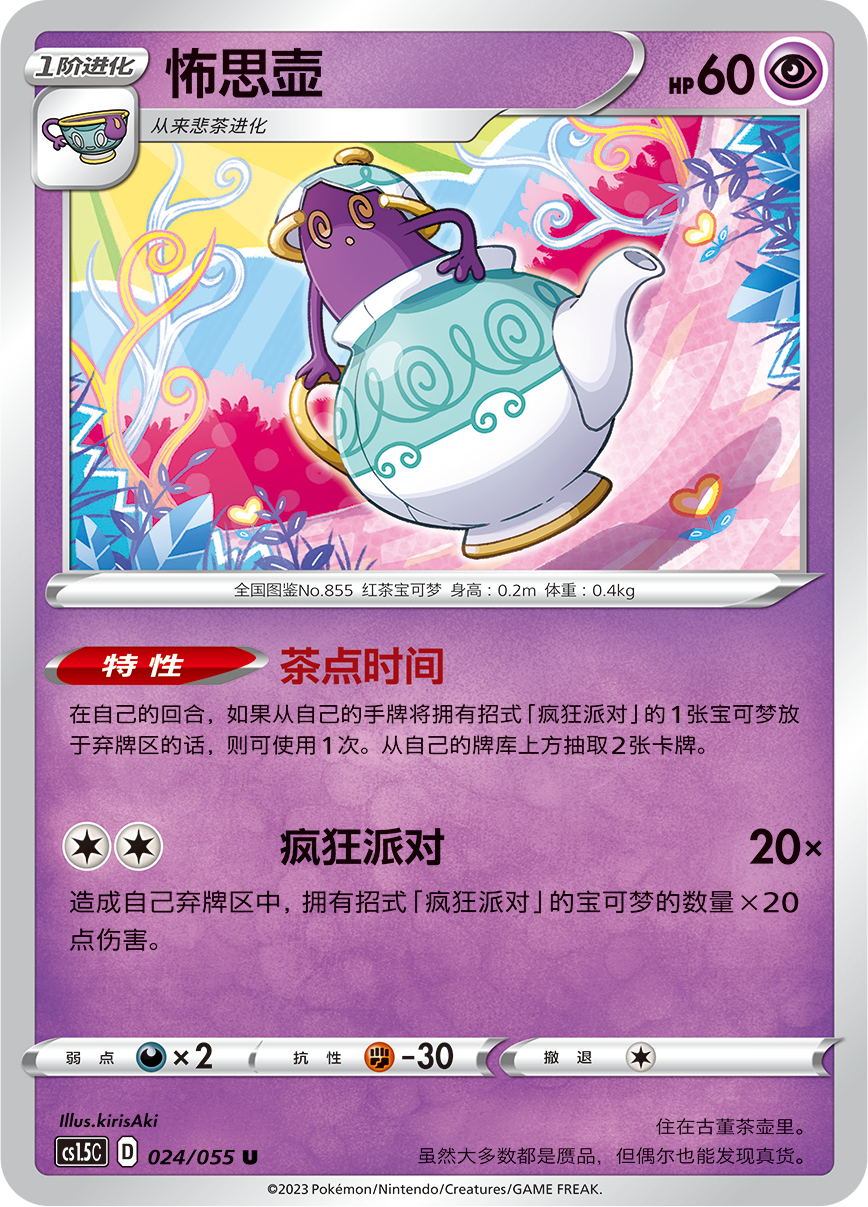怖思壶是这套组合的核心卡牌。可以在自己的回合利用其特性【茶点时间】,将手牌里拥有招式【疯狂派对】的宝可梦放于弃牌区,并抽取卡牌,在提升【疯狂派对】伤害的同时还能补充手牌,尽早培育出来发挥最大效用吧。