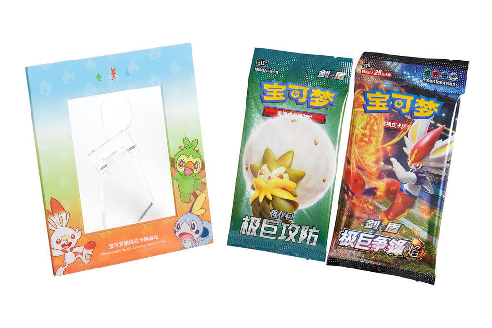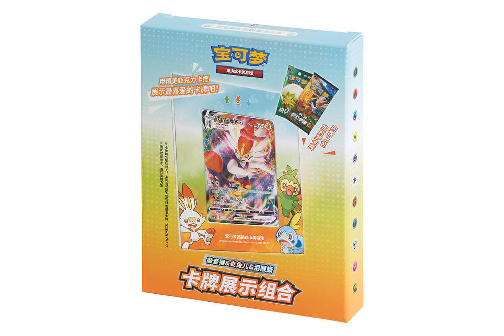 宝可梦卡牌展示组合 敲音猴&炎兔儿&泪眼蜥产品规格:敲音猴&炎兔儿&泪眼蜥展示卡框1个,【极巨争锋 焰】补充包(25张装)1包,【极巨攻防】强化包(6张装)1包。
