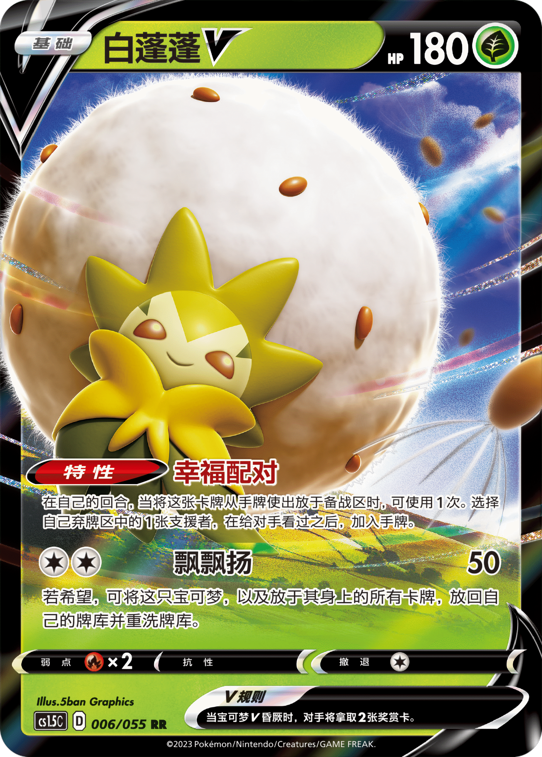 【极巨攻防】的封面宝可梦是泛用性很高的白蓬蓬V。 当你从手牌里将白蓬蓬V放至备战区时,可以通过特性【幸福配对】,从弃牌区回收一张支援者卡加入手牌。这个特性能让你根据场上的情况,从弃牌区里选择相应的支援者卡来从容应对,正因如此白蓬蓬V能让你的卡组更加“幸福”。 招式【飘飘扬】只需要2个无属性能量便能发动,除了会造成50点伤害之外,还能让自己及放于身上的卡牌回到牌库。之后再让白蓬蓬V从手牌中登场,便能再次发动【幸福配对】,是非常灵活且好用的招式。