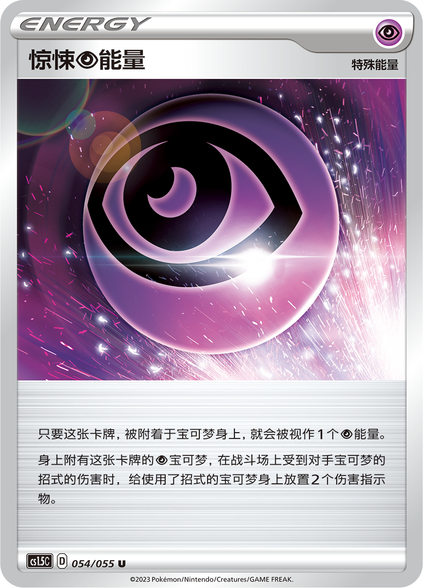 【惊悚超能量】可以让附着了该能量的超属性宝可梦,在战斗场上受到对手宝可梦招式伤害时,给发动招式的宝可梦身上放置2个伤害指示物。将【惊悚超能量】附着给高HP的超属性宝可梦,让对手陷入痛苦深渊吧。※该效果可叠加。