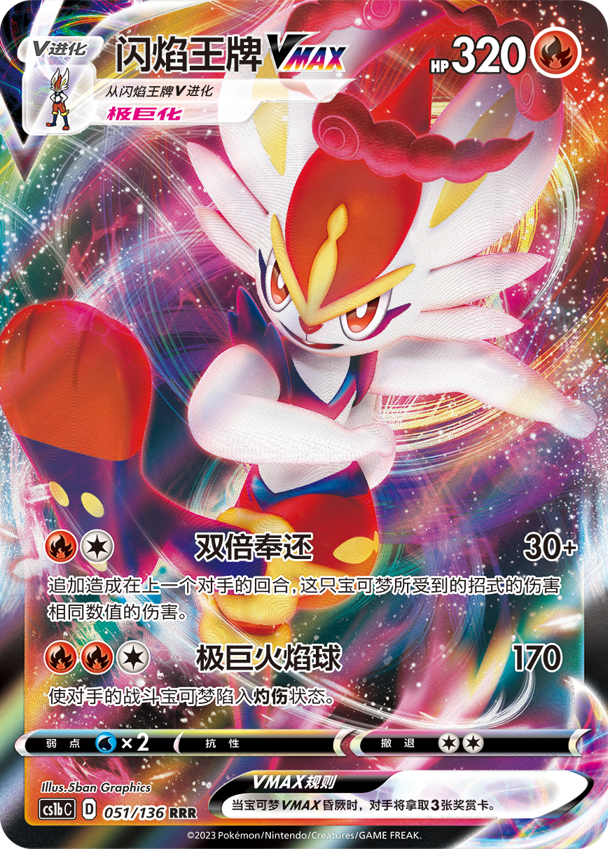 而进化后的闪焰王牌VMAX则拥有强大的进攻能力,【双倍奉还】可将上回合受到的伤害+30点返还给对方,配合自身高达320点的HP能将该招式发挥到极致。