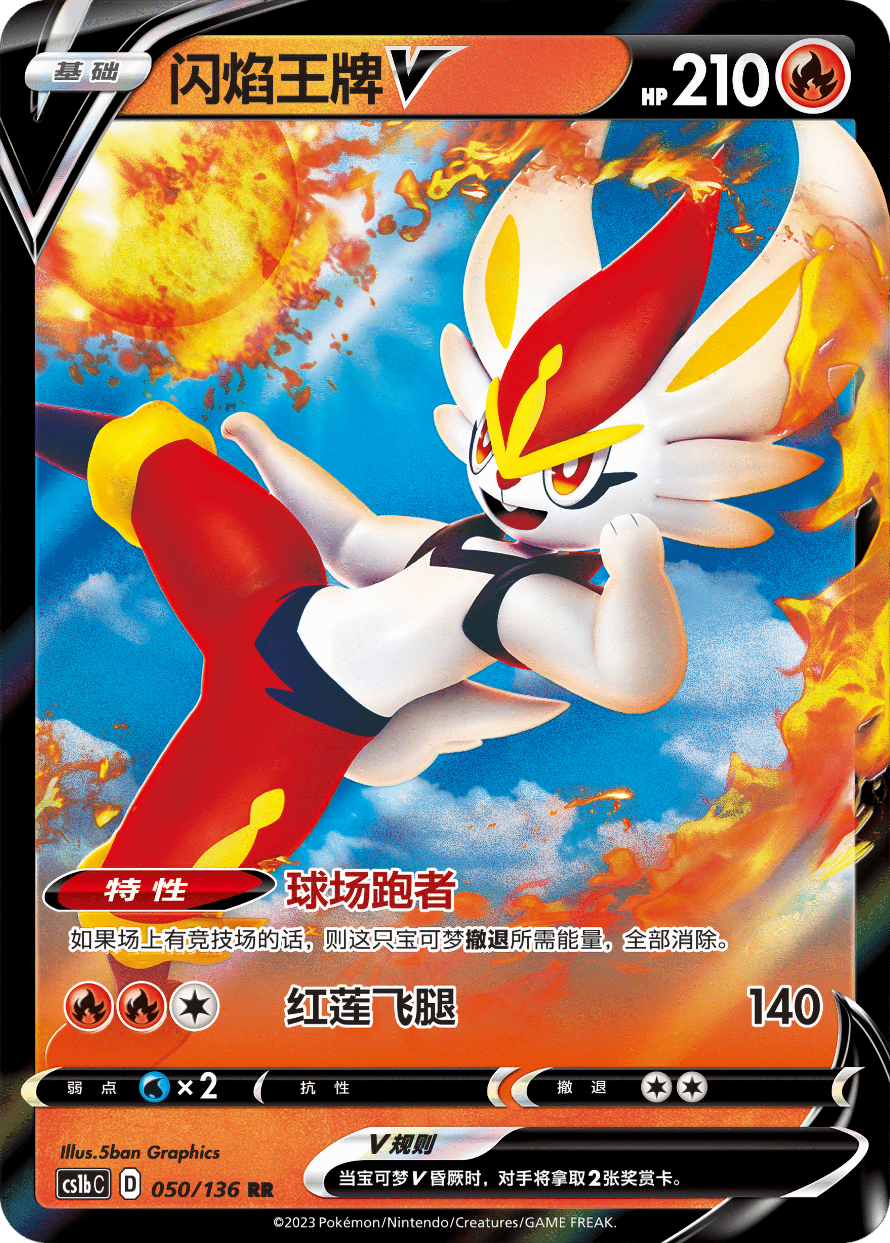 特性【球场跑者】使闪焰王牌V灵活性十足。只要场上有竞技场,闪焰王牌V撤退时所需要的能量就会全部消除,尝试用它的灵动去打乱对手的节奏吧。