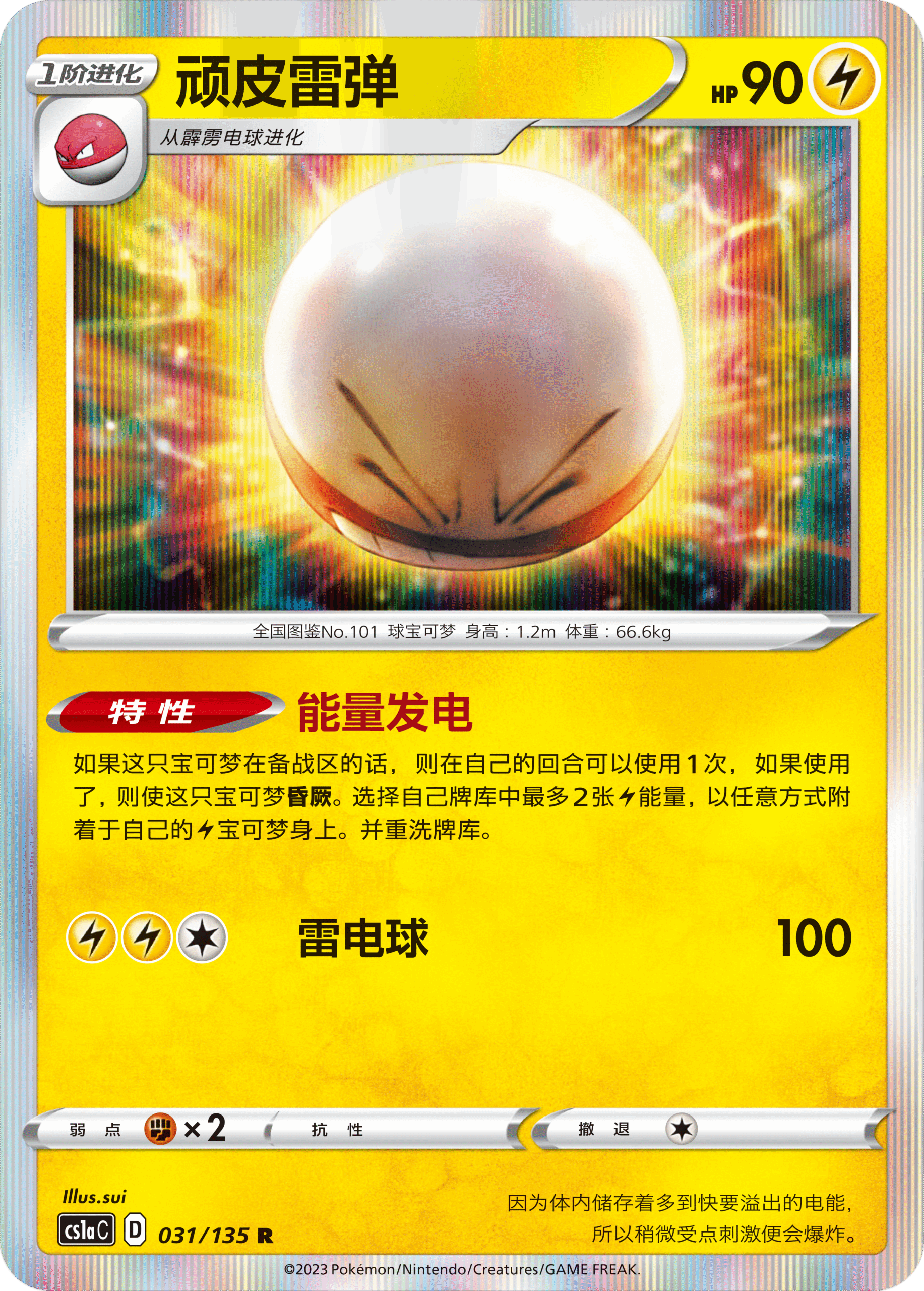 虽然在使用特性【能量发电】后顽皮雷弹会陷入昏厥,但训练家可以从牌库中选择最多2张雷属性能量以任意形式附着给自己的雷属性宝可梦,时刻保持能量充足。而进化熏香则能从牌库里选择一张进化宝可梦加入手牌,加速宝可梦的成长。