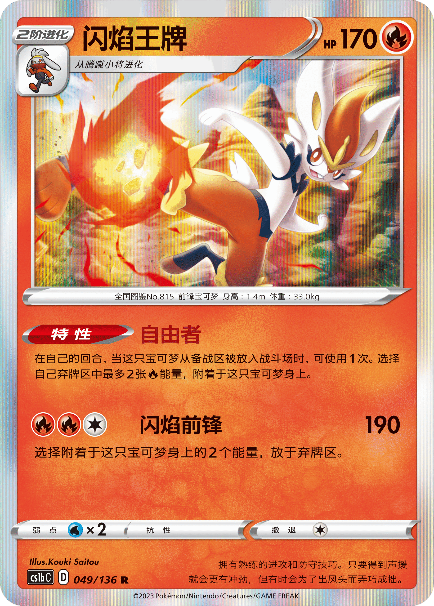 闪焰王牌的招式【闪焰前锋】可稳定造成190点伤害,虽然发动后需要将2个能量放于弃牌区,但当闪焰王牌被从备战区放入战斗场时,可通过特性【自由者】将丢弃的火属性能量重新附于身上。