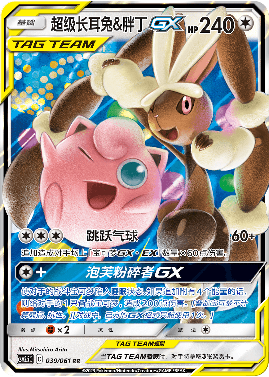 【泡芙粉碎者GX】可让对手战斗宝可梦陷入睡眠状态,若追加4个任意属性能量,还可给1只备战宝可梦造成200点伤害。同时超级长耳兔&胖丁GX还是无色属性宝可梦卡牌,万能的它可和各种卡组配合。