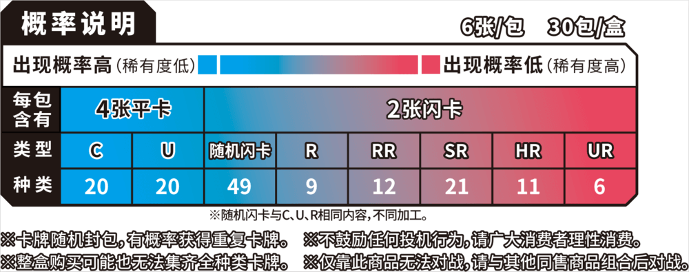 | 单包商品内容: | 内含6张卡牌(包含2张闪卡) ※卡牌均为随机封入 ※强化包需配合起始卡组、补充包等方可进行对战 |