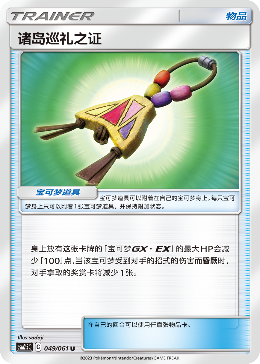 宝可梦道具卡诸岛巡礼之证:当身上放有这张卡牌的宝可梦GX被对手招式昏厥后,可让对手拿取的奖赏卡减少1张。虽然它还有另外一个效果——让该宝可梦GX的最大HP减少100点,但看准时机使用既能有效干扰对手,也能配合花舞鸟GX的特性,让花舞鸟GX在己方战场上翩翩起舞。小提示:诸岛巡礼之证只有放在宝可梦GX身上才能发挥效果。