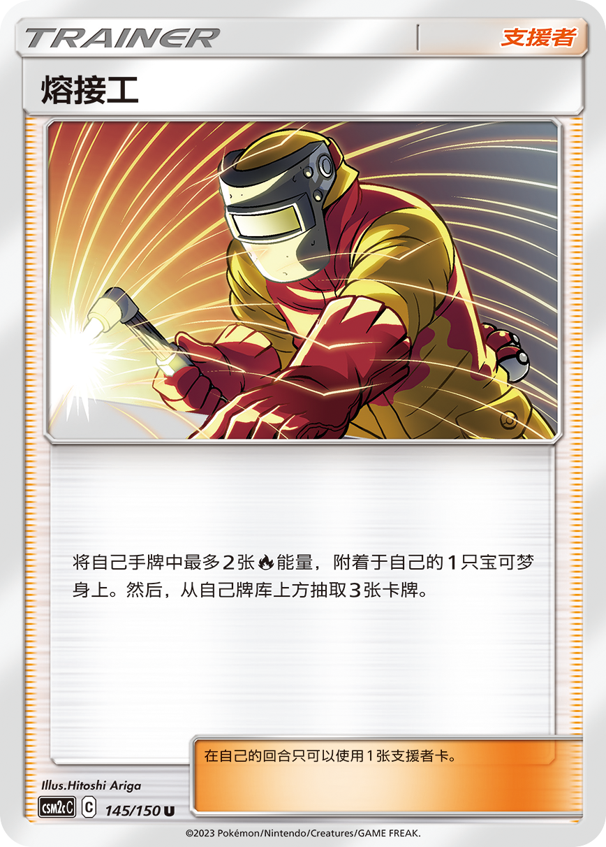 支援者卡【熔接工】可将手牌内最多2张火属性能量附着于自己任意1只宝可梦身上,同时还能从牌库为自己补充3张手牌。竞技场卡【巨大炉灶】可在自己的回合,通过弃掉1张卡牌,将牌库里2张火属性能量加入手牌。两者结合使用可以为己方火属性宝可梦快速附着能量建立优势。