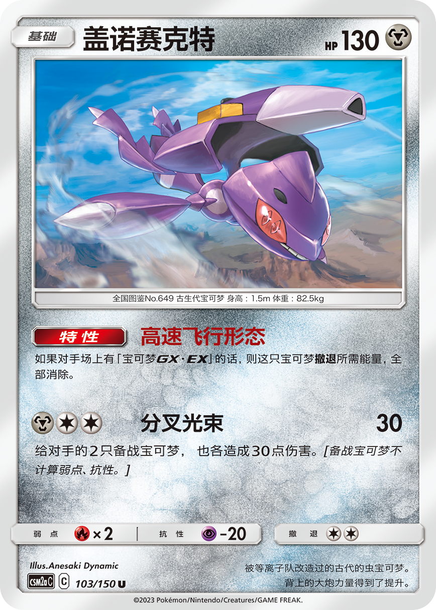 只要对手场上有宝可梦GX,盖诺赛克特的特性【高速飞行形态】就能让它的撤退能量全部消除。【分叉光束】除了对战斗宝可梦造成30点伤害外,还可给对手2只备战宝可梦也造成30点伤害,能给对方未进化的后排宝可梦造成有效打击。