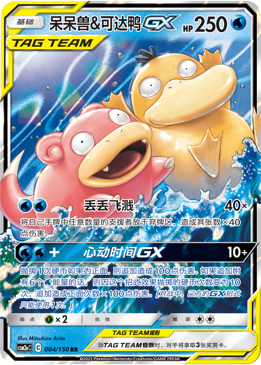 呆呆兽&可达鸭GX作为基础宝可梦拥有250点HP,上场后可吸引一定的火力。2个水属性能量即可发动的【丢丢飞溅】可弃掉手牌中的支援者卡牌,造成丢弃数量x40点伤害。