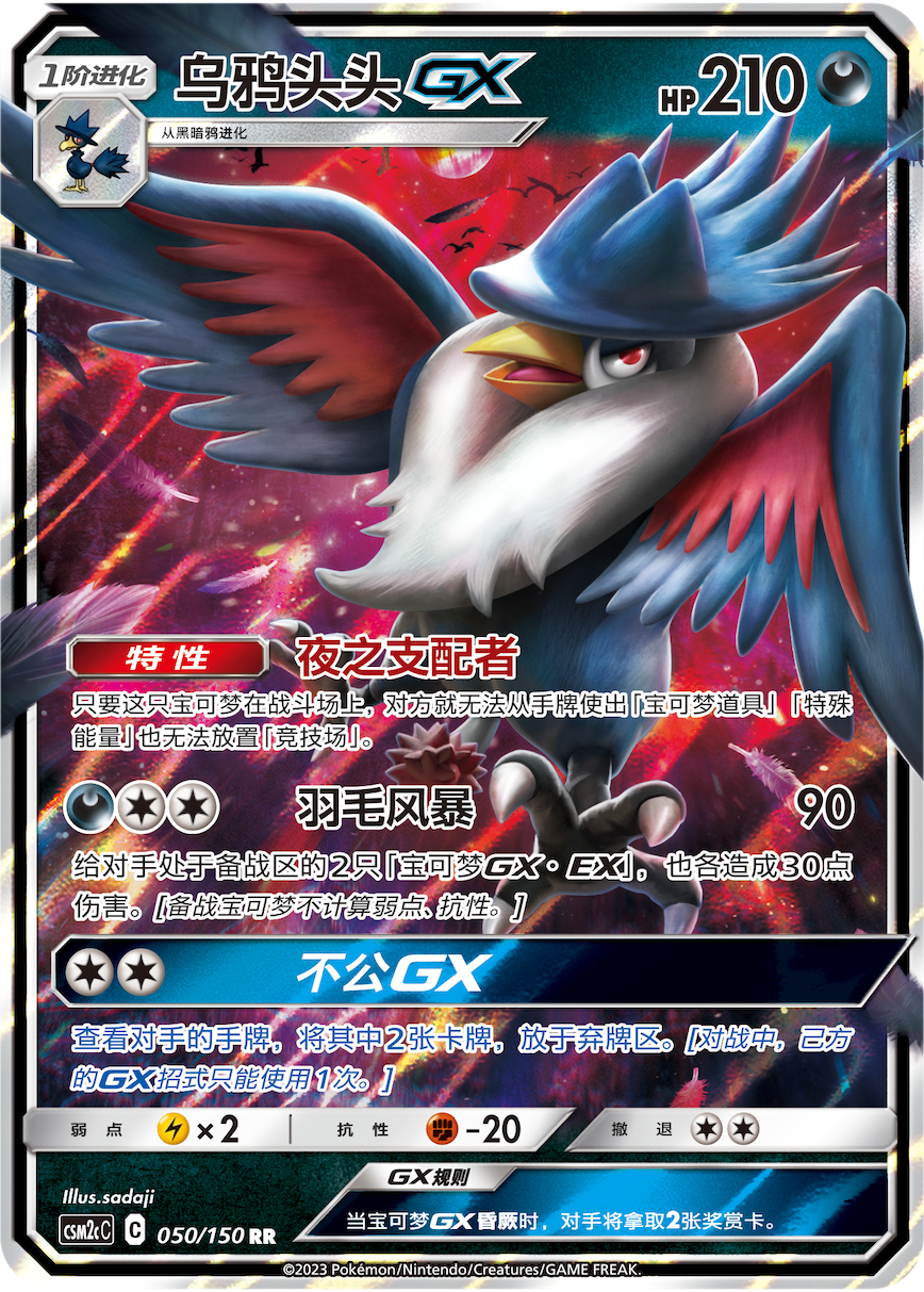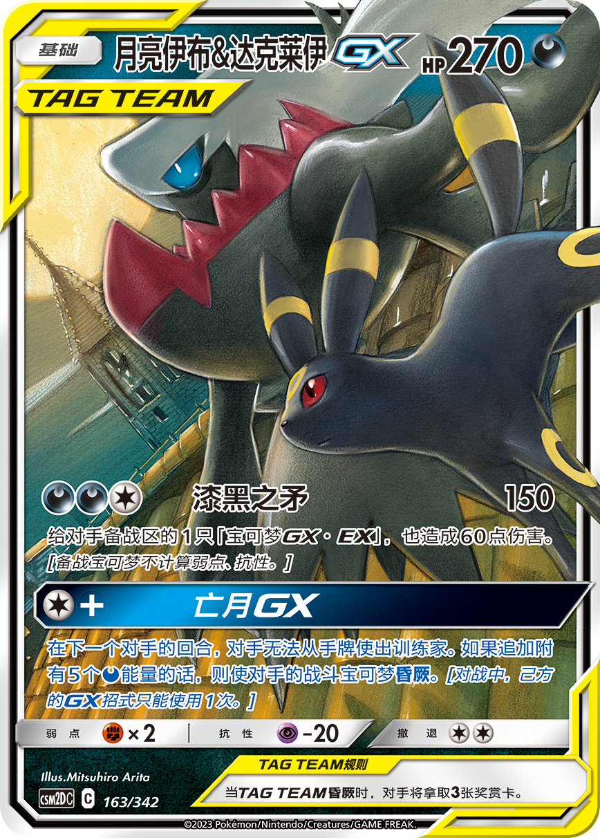月亮伊布&达克莱伊GX的【亡月GX】,发动条件仅为1个任意属性能量,效果为下一个对手的回合,对手将无法从手牌中使出训练家卡牌。然而追加附有5个恶属性能量的话,可使对手的战斗宝可梦直接昏厥。瞬间减员+限制手牌使用,战局从此刻逆转。