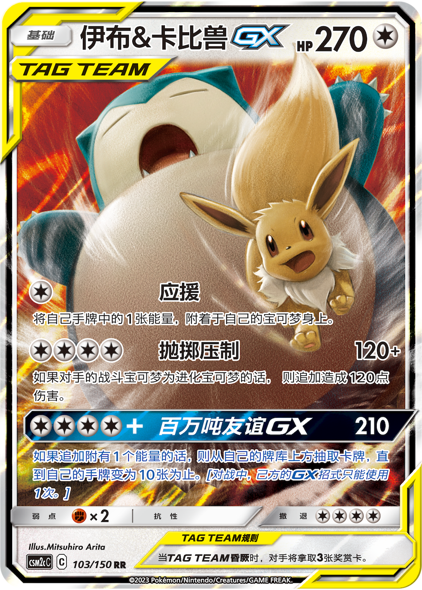 【百万吨友谊GX】可造成210点伤害,若追加附有1个能量的话,还可从牌库中抽牌直到自己的手牌变为10张。由于伊布&卡比兽GX的招式所需能量均为任意属性,因此它也能和很多卡组搭配使用,泛用性非常高。