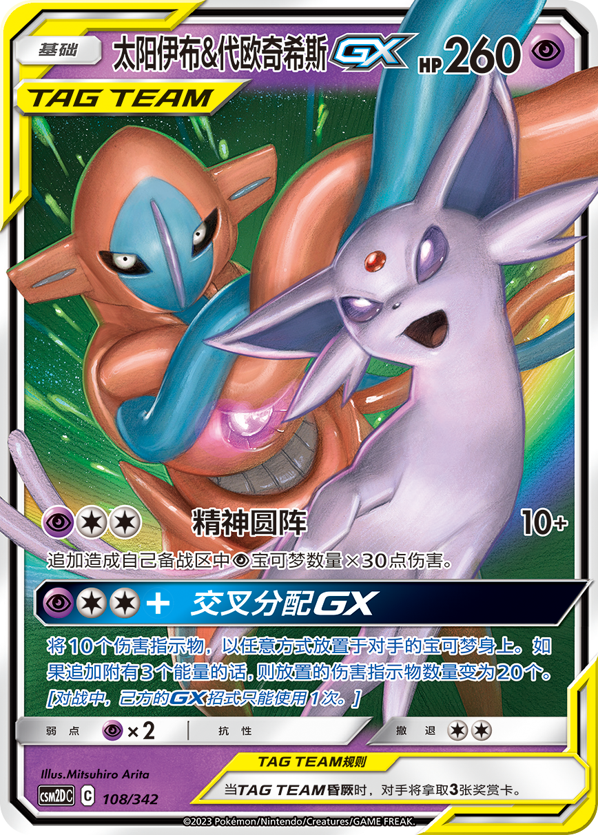例如太阳伊布&代欧奇希斯GX的【交叉分配GX】,当它附着了1个超属性能量和2个任意属性能量时即可发动,可将10个伤害指示物以任意方式放置于对手的宝可梦身上,一旦追加附有3个任意属性能量,可放置的伤害指示物数量剧增为20个!