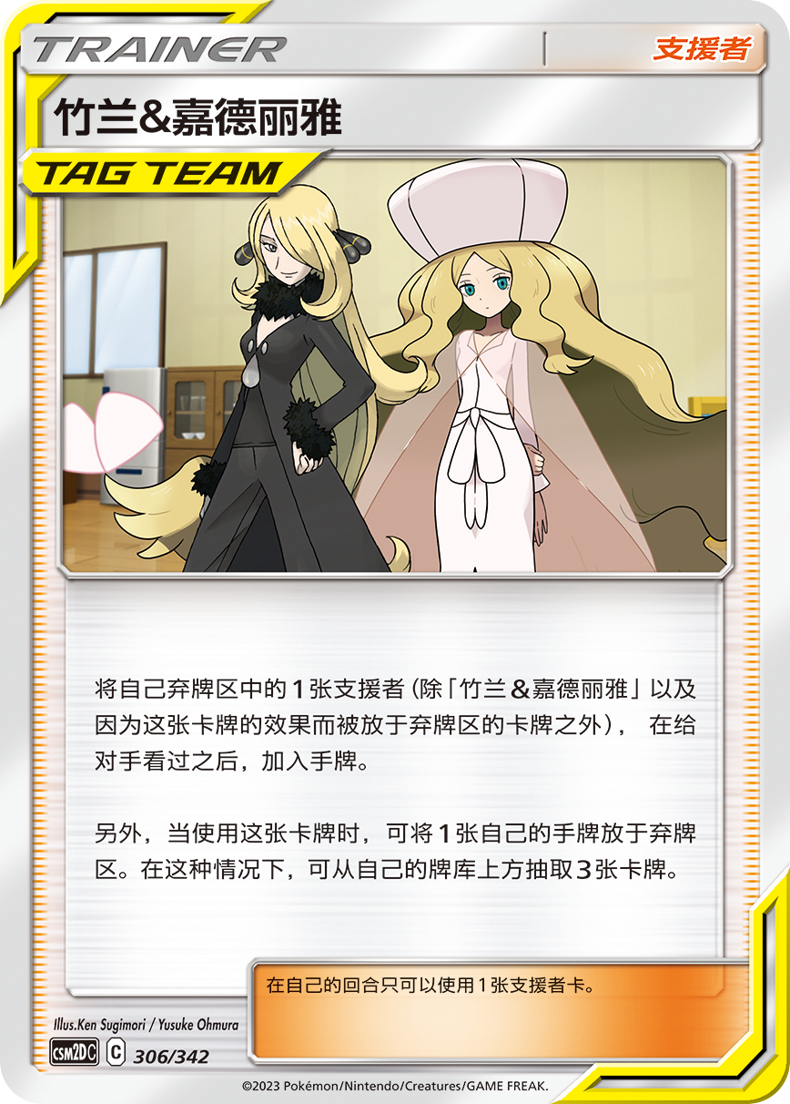 玛奥&水莲使用后可将自己的战斗宝可梦和备战宝可梦互换,若使用的同时弃掉2张手牌的话,被换到备战区的宝可梦还可追加回复120点HP。竹兰&嘉德丽雅也是同样,使用时若选择弃掉一张手牌,追加效果为从自己牌库上方抽取3张卡牌。