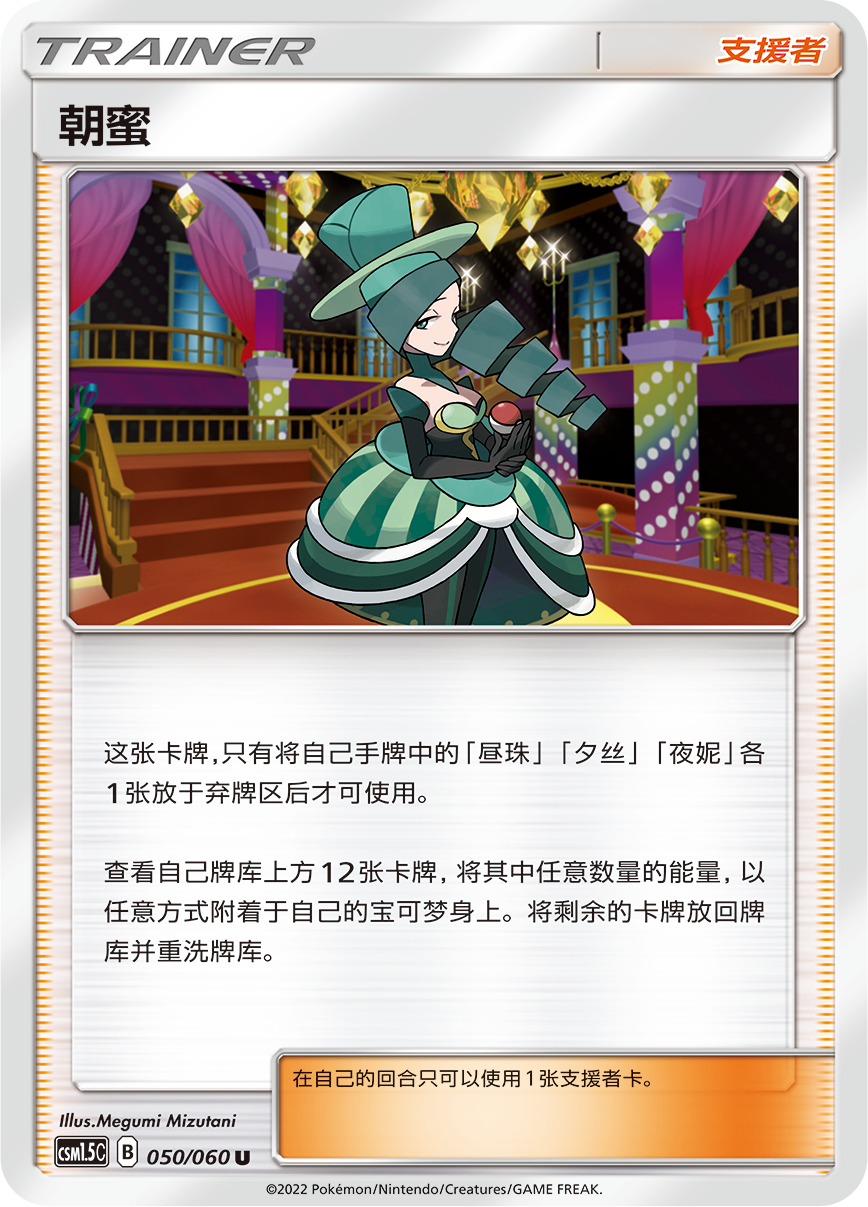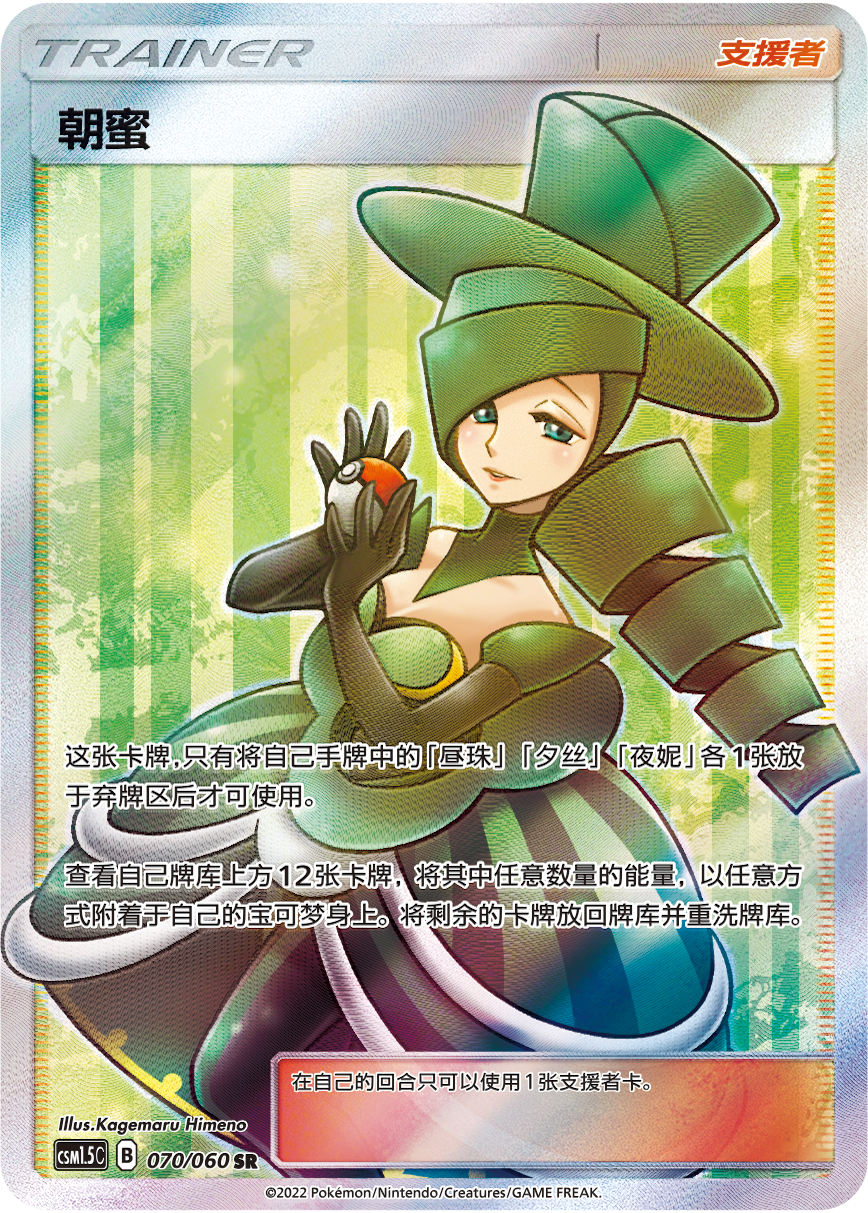 身为大姐的朝蜜,发动效果为从查看自己牌库上方的12张卡牌,将其中的能量以任意方式附着在己方宝可梦身上,快速填能让你掌握战局主动权。