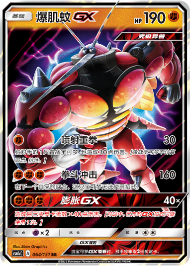 爆肌蚊GX的3个招式均为伤害招式,【喷射重拳】除了能给战斗宝可梦造成30点伤害以外,还能让对手1只备战宝可梦也受到30点伤害。
