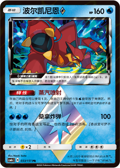 冰伊布GX能通过伊布的特性【能量进化】快速进化,而能量签则能确保你抽到需要进化成冰伊布GX所需的水属性能量。【棱镜之星】卡牌波尔凯尼恩的【桑拿炸弹】能对对手的所有备战区宝可梦造成20点伤害,特性【蒸汽喷射】可以在弃掉一张水属性能量后将对手的战斗宝可梦和备战宝可梦互换,便于冰伊布GX进行精确打击。