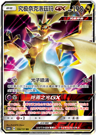 补充包【赫】里收录的究极奈克洛兹玛GX是一张攻击性能超强的卡牌,对战时可以通过丢弃附着于身上的超属性能量来提升【光子喷涌】的伤害。
