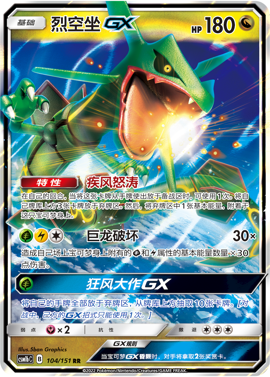 烈空坐GX是一张己方宝可梦身上的能量越多,造成的伤害就越高的强力卡牌。【巨龙破坏】作为成长型招式,能依据己方场上宝可梦身上附着的草、雷属性能量的数量,造成可观伤害。