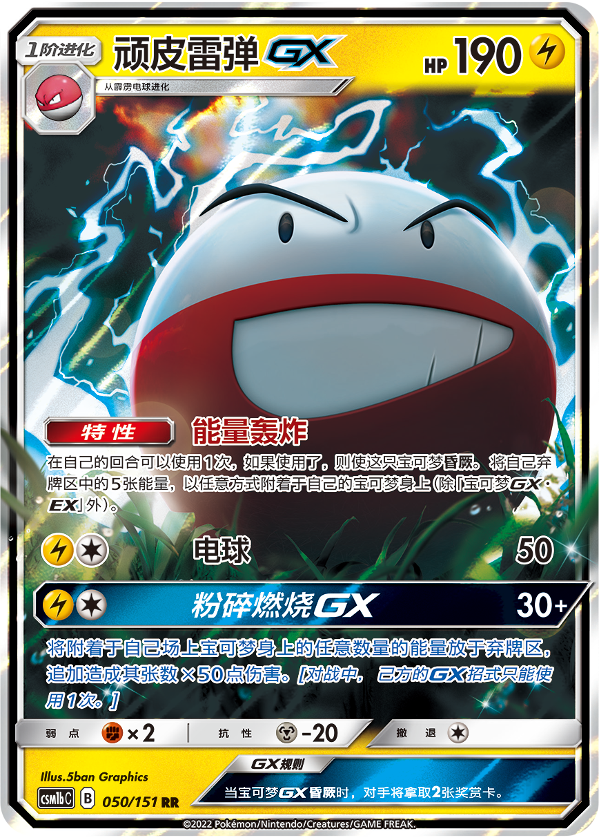 GX招式【粉碎燃烧GX】可通过弃掉己方场上宝可梦身上的任意数量能量,来造成其张数x50的高额伤害。