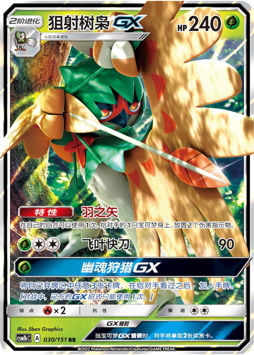 狙射树枭GX不光可通过【飞叶快刀】进行攻击,它的特性【羽之矢】更可以给对手的任意宝可梦造成伤害,仅在一回合内就能进行2次攻击。