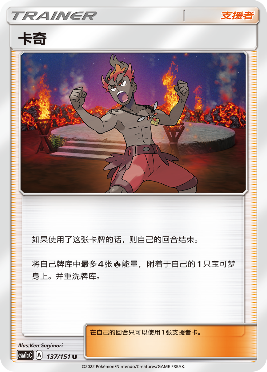 【红莲风暴】虽然强力但使用后会弃掉3个火能量,而支援者卡【卡奇】能为喷火龙GX附着最多4个火能量,物品卡【打火石】可获取最多4个火能量加入手牌,为喷火龙GX提供持久续航。