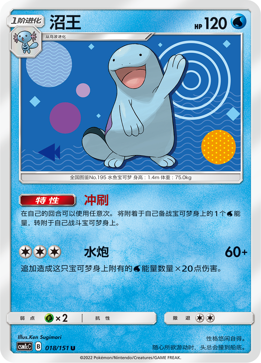 宝可梦【沼王】的特性【冲刷】可将自己身上附着的1个水能量转附给战斗宝可梦,招式【水炮】也是自己附着的水能量越多造成的伤害也越大。【水补丁】则能将弃牌区的1张水能量附着于备战区的水属性宝可梦身上,通过和帕路奇亚GX的配合就能让水能量的使用效率最大化。