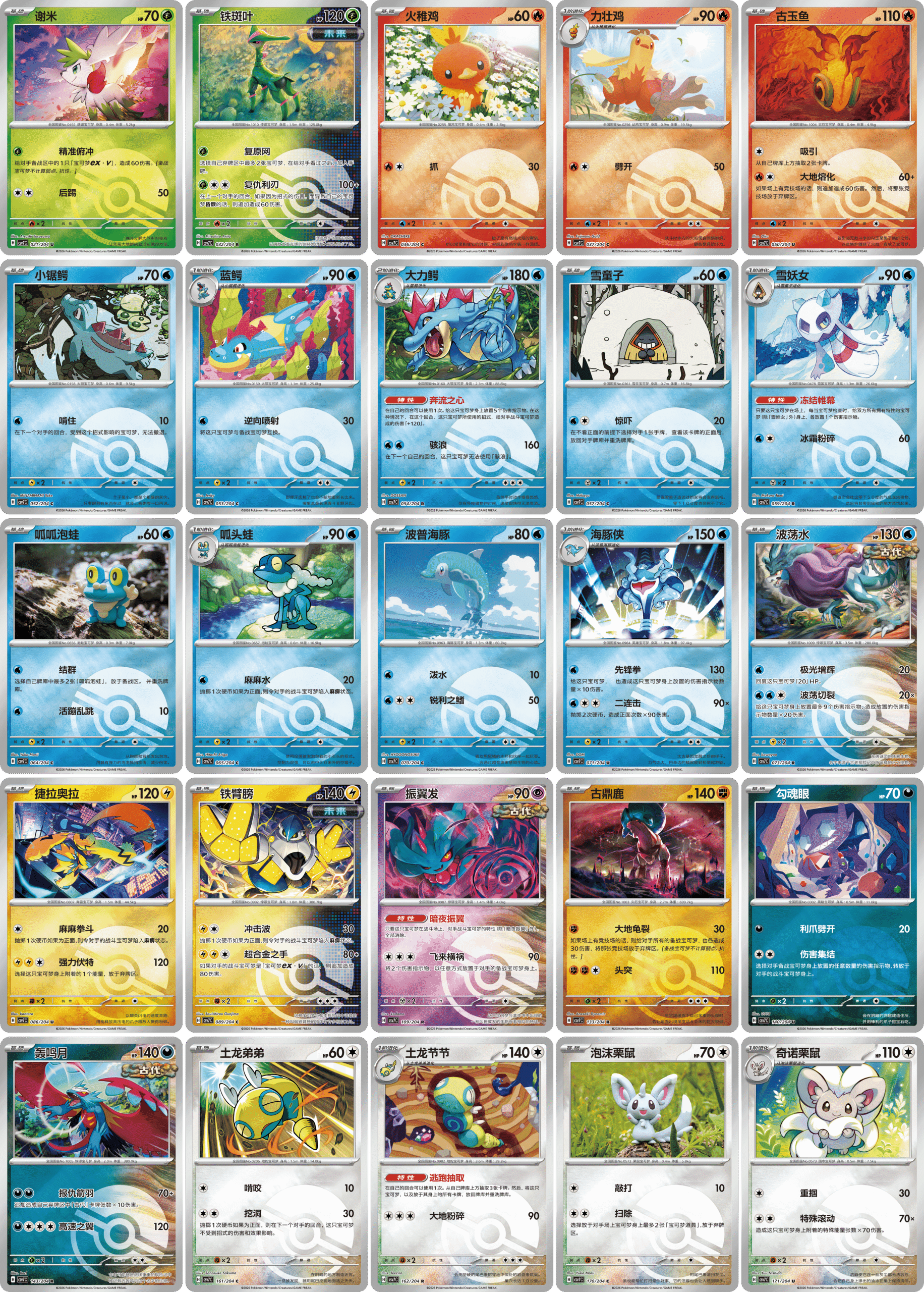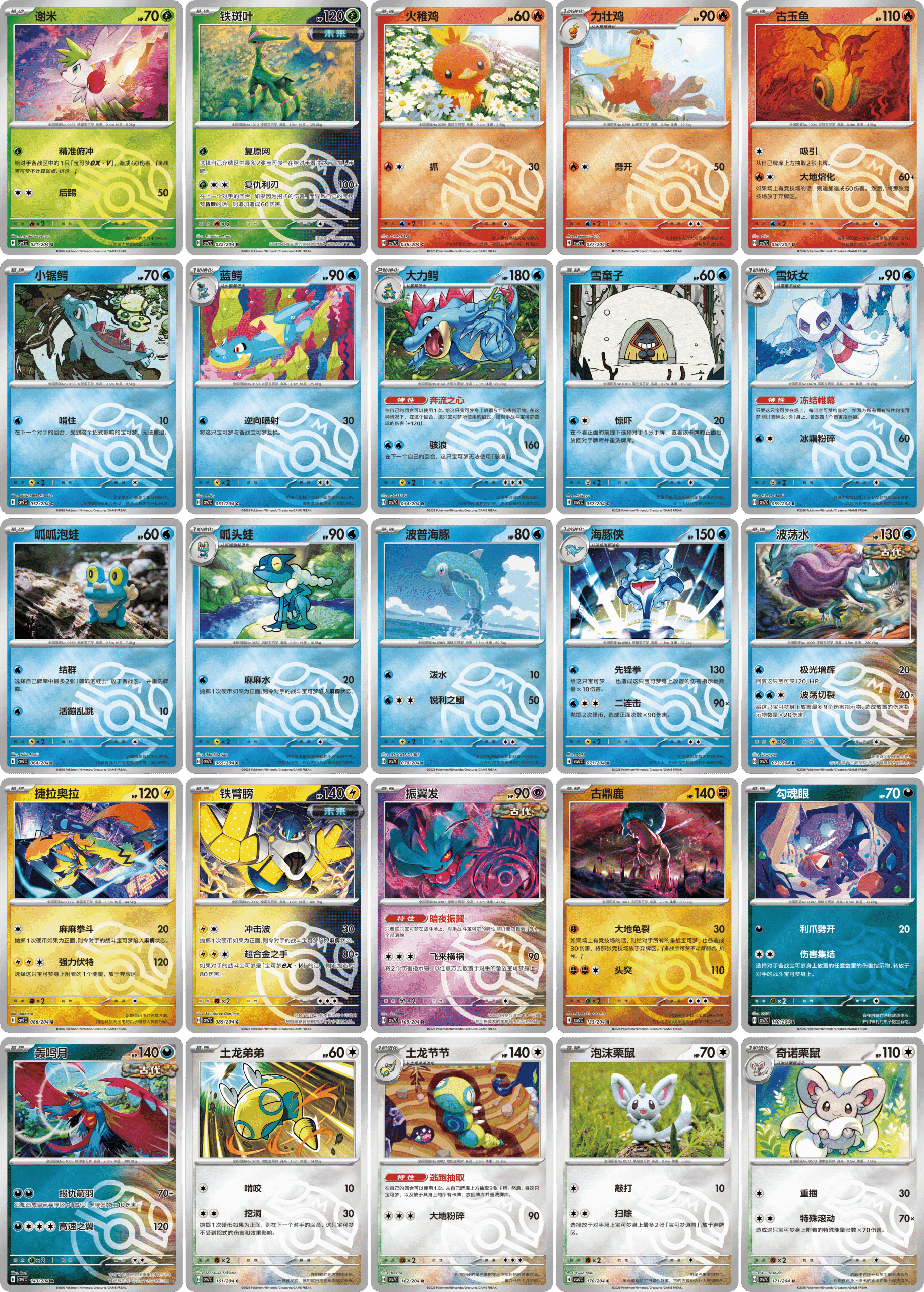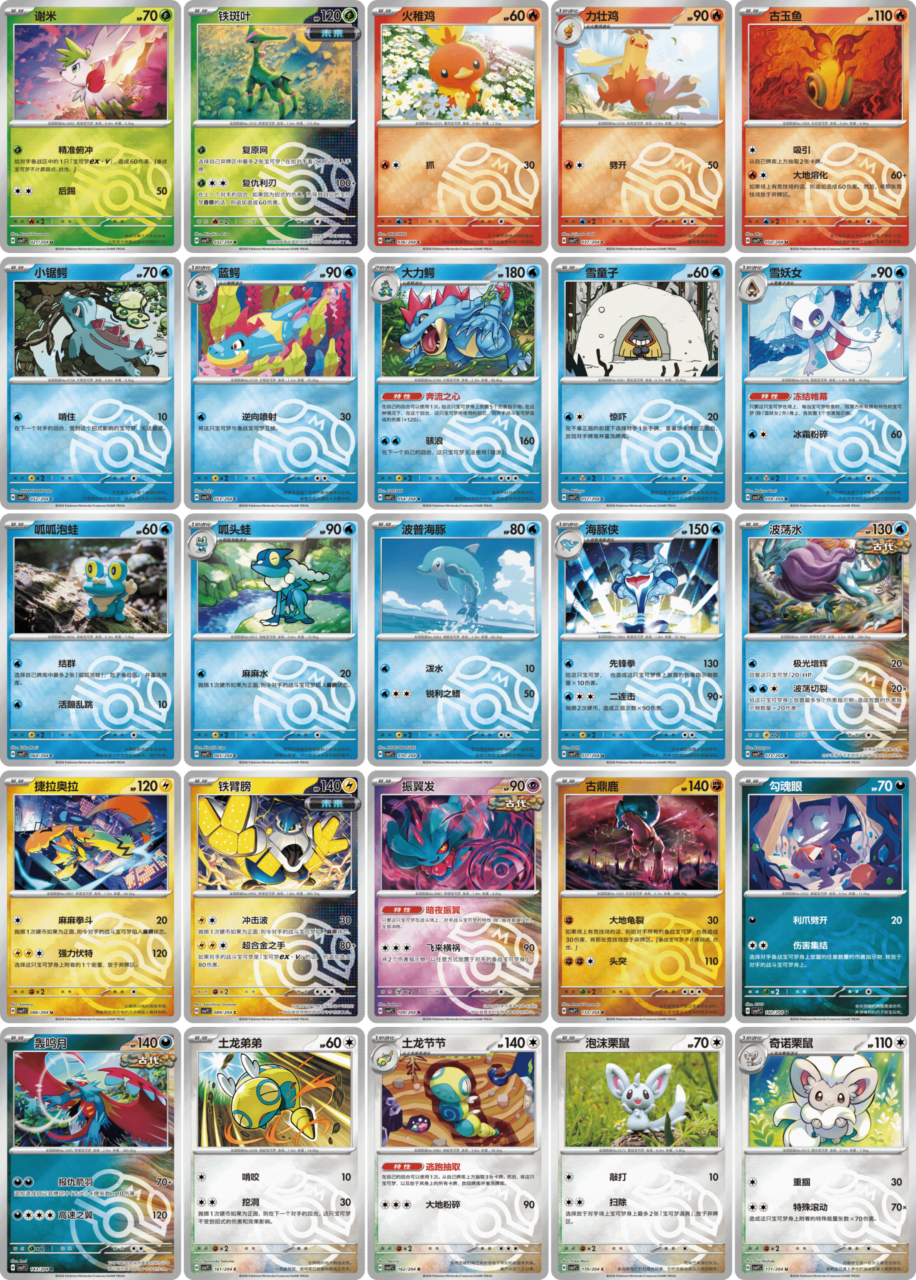 C/U/R稀有度的宝可梦闪卡合计25种。并且,C/U/R稀有度的宝可梦闪卡既可能是精灵球纹样的闪卡,也可能是大师球纹样的闪卡。(精灵球纹样闪卡与大师球纹样闪卡的生产配比为99:1)