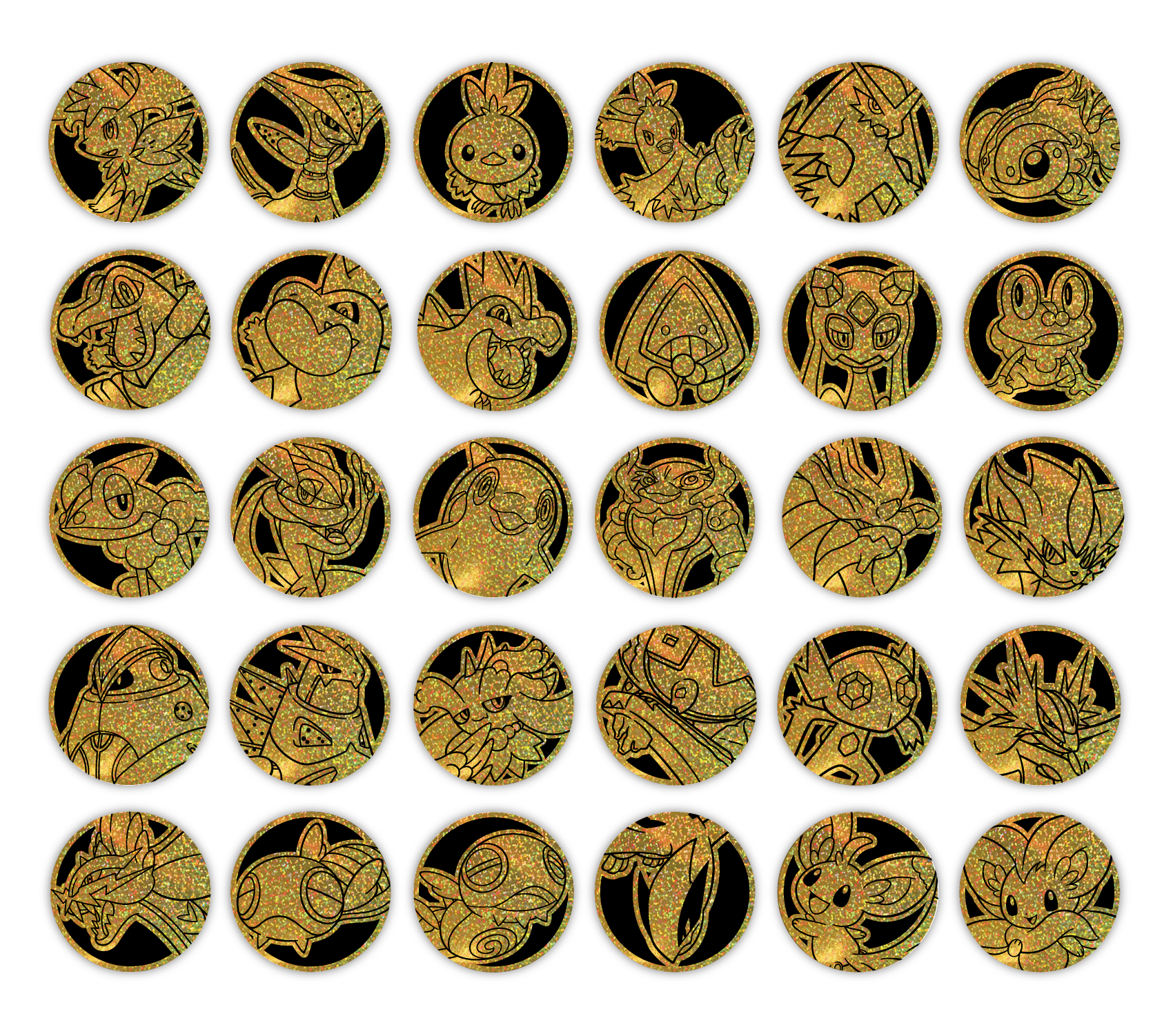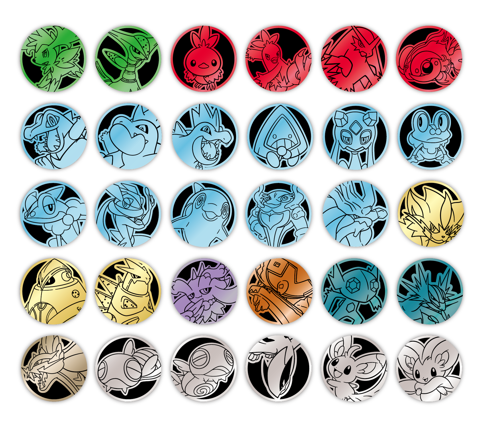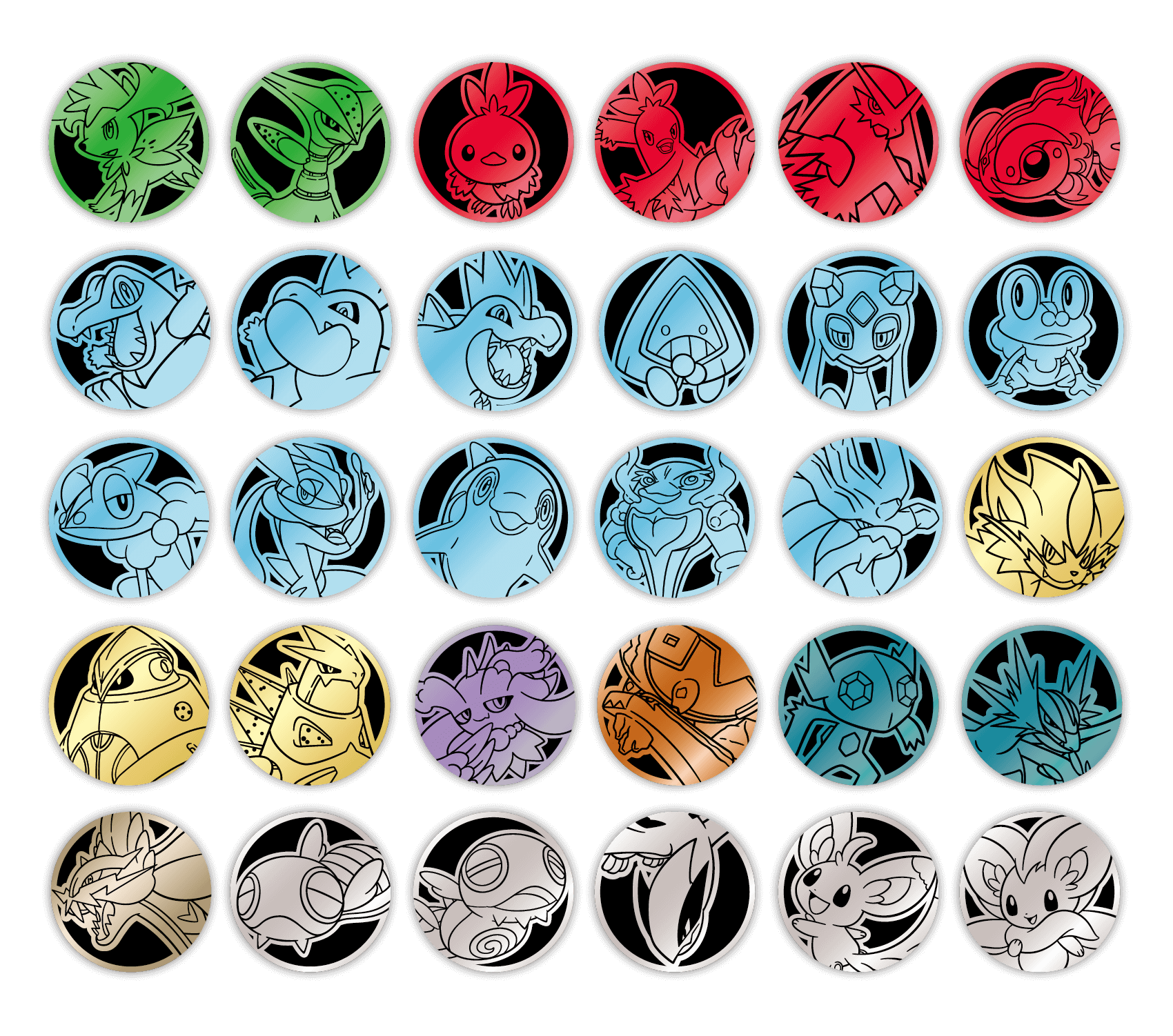 套装内含的宝可梦主题硬币与利刃猛醒精选闪卡的宝可梦相对应。每只宝可梦的主题硬币都有3种款式。