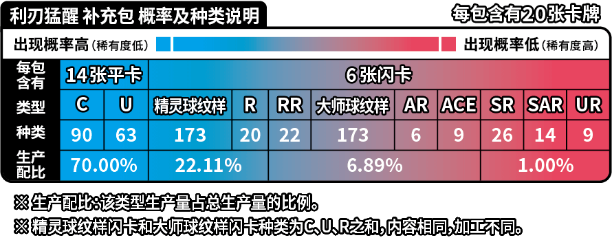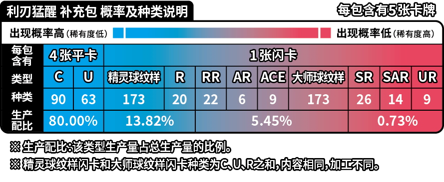 | 商品内容 | 1.利刃猛醒 补充包(5张) 3包 2.利刃猛醒 精选闪卡 1张(不同编号共30种,每种等比生产。其中RR5种, C/U/R 合计25种。 C/U/R 为精灵球纹样闪卡或大师球纹样闪卡,生产配比为99:1) 3.主题硬币 1枚(共3种款式,其中2种为普通款,1种为隐藏款,内容相同,仅加工方式不同。2种普通款等比生产,普通款与隐藏款的生产配比为99:1) |
