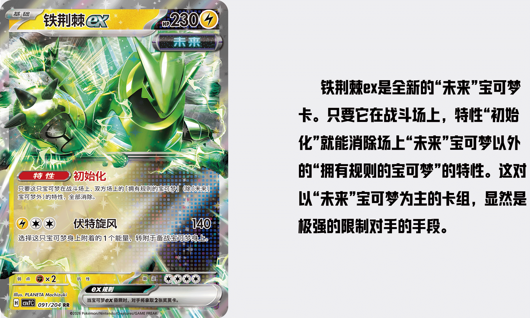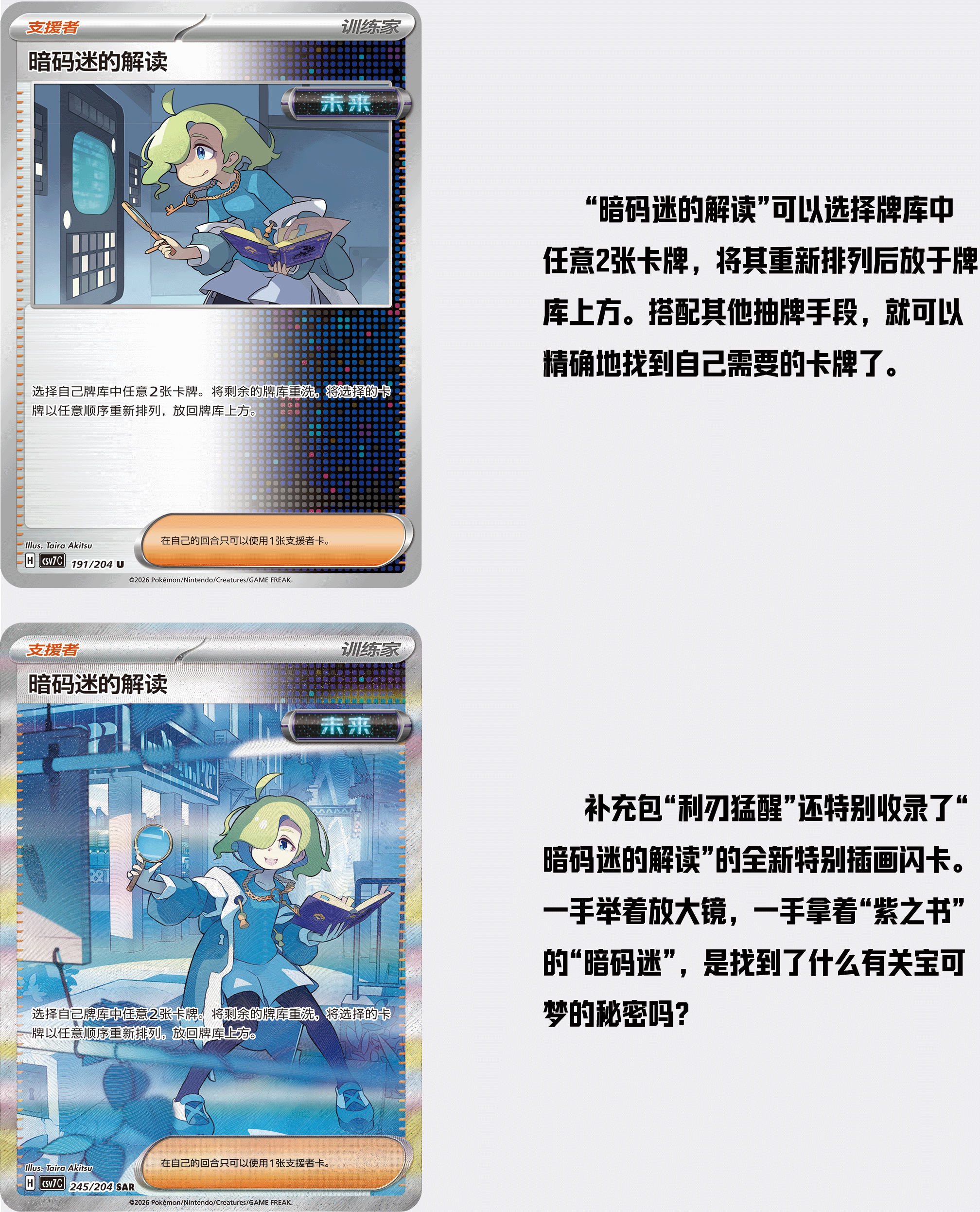 补充包“利刃猛醒”中收录了两百多张赛制标记为“H”的全新卡牌,其中既有太晶化的宝可梦ex卡,也有“古代”“未来”的宝可梦卡。