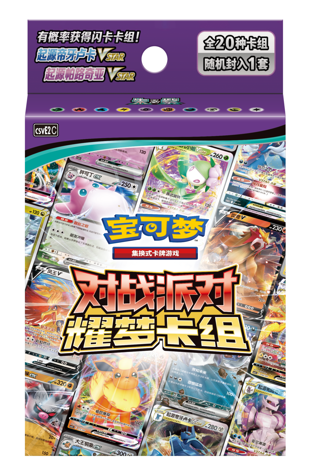 “对战派对 耀梦卡组”共收录18种玩法各异,已经预先构筑好的卡组。如果你的运气足够好的话,还有机会获得起源帝牙卢卡VSTAR闪卡卡组或者起源帕路奇亚VSTAR闪卡卡组!