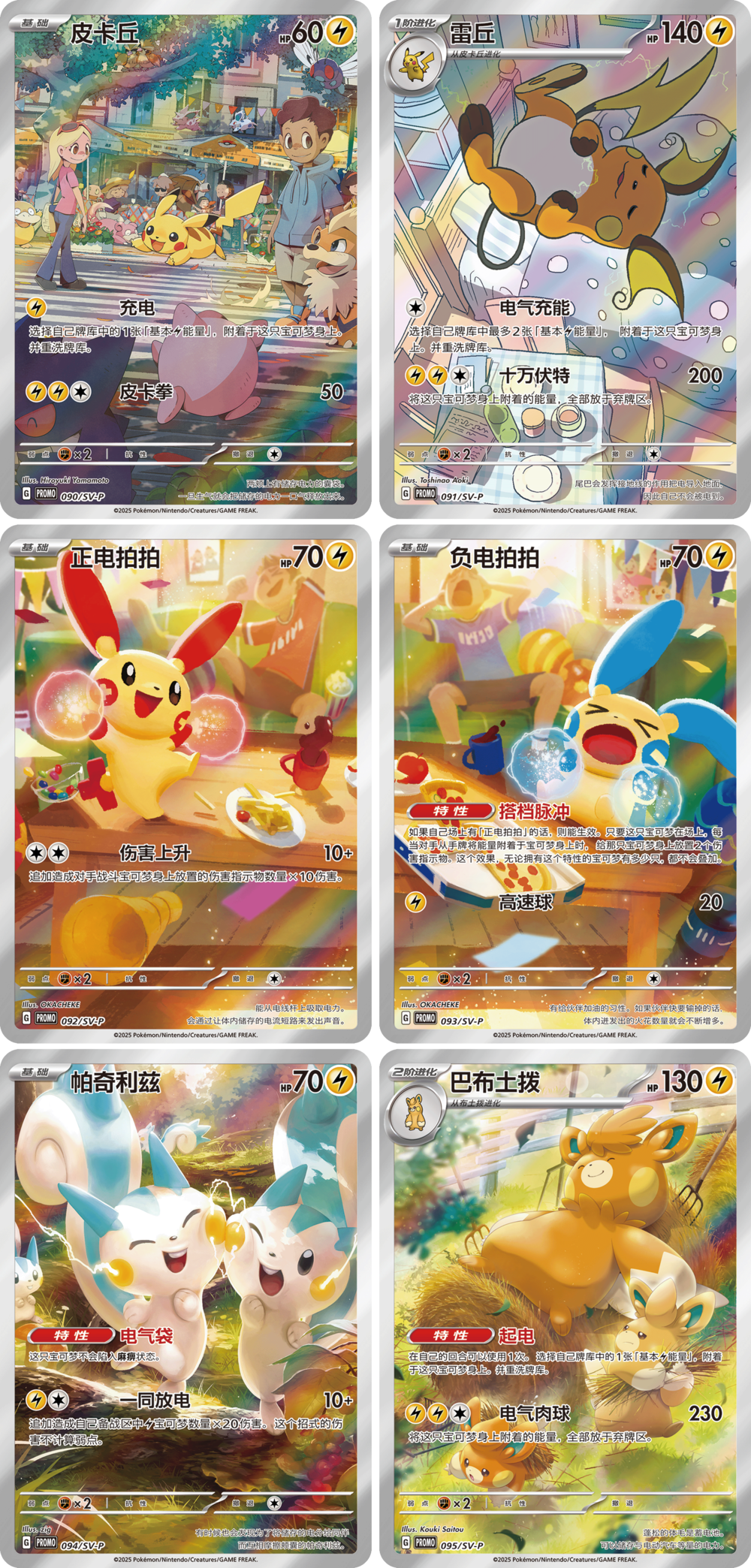 蹭蹭脸颊毛绒玩具卡牌展示礼盒内含1张精美的艺术插画闪卡,其中6款为普通款。出现在这些卡牌上的,都是能学会招式“蹭蹭脸颊”的电属性宝可梦。