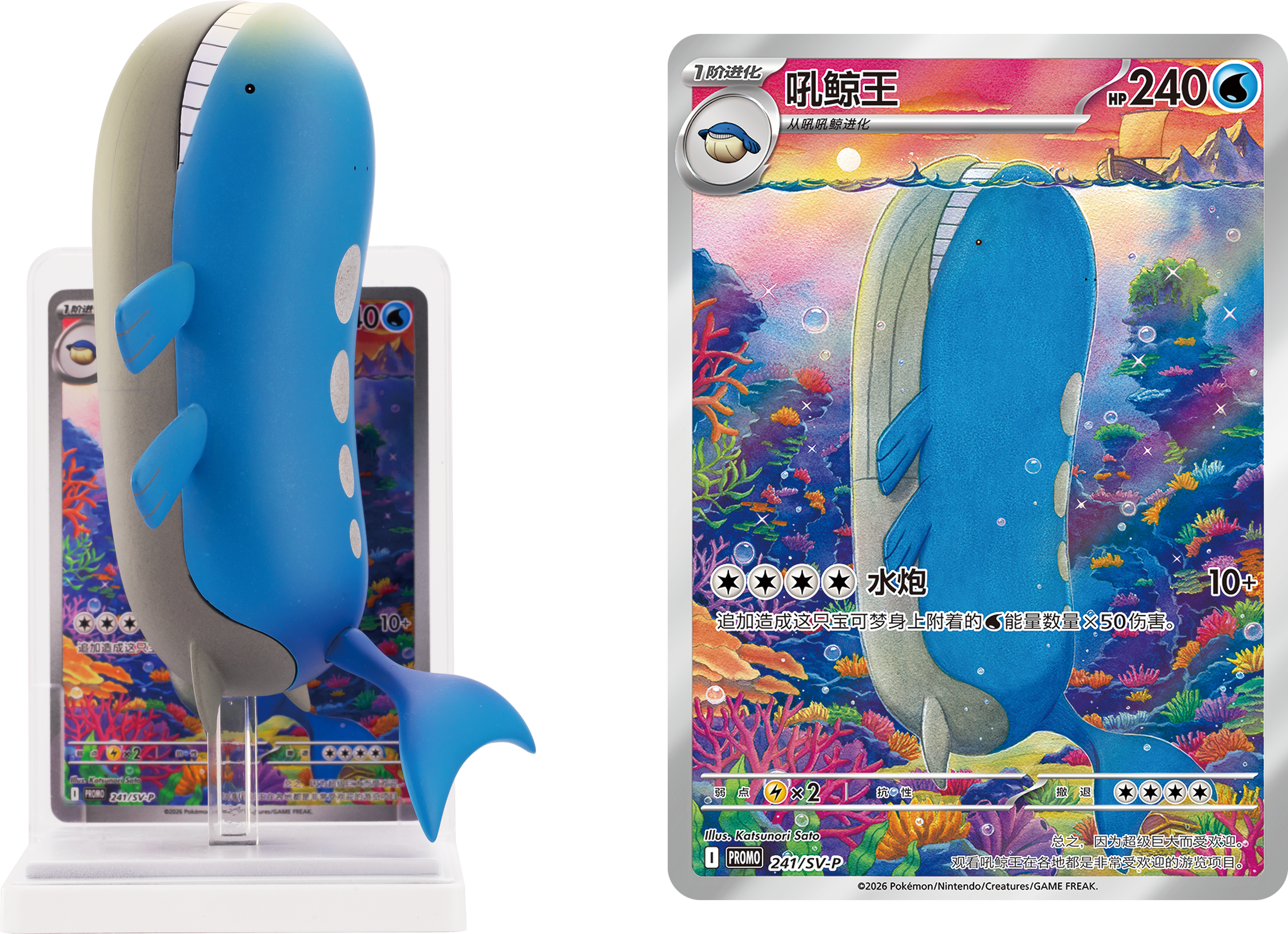 如果你的运气足够好,还有机会获得隐藏款的宝可梦手办,以及对应的艺术插画闪卡!艺术插画中,从色彩斑斓的海底向海面微微探身而出的吼鲸王是如此庞大,将周围的船只、岛屿都映衬得渺小无比。手办不仅还原了插画中吼鲸王纵贯深海的巨大形象,还将它悠然自如的呆萌表情刻画得惟妙惟肖,令人爱不释手。