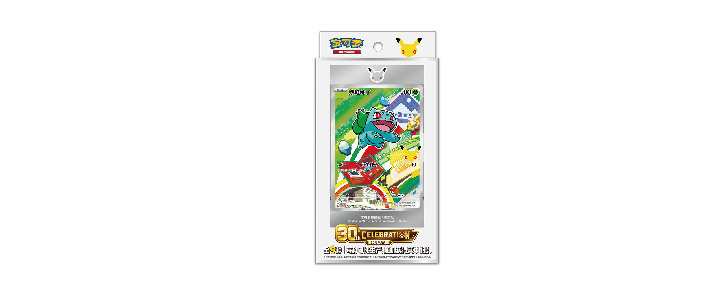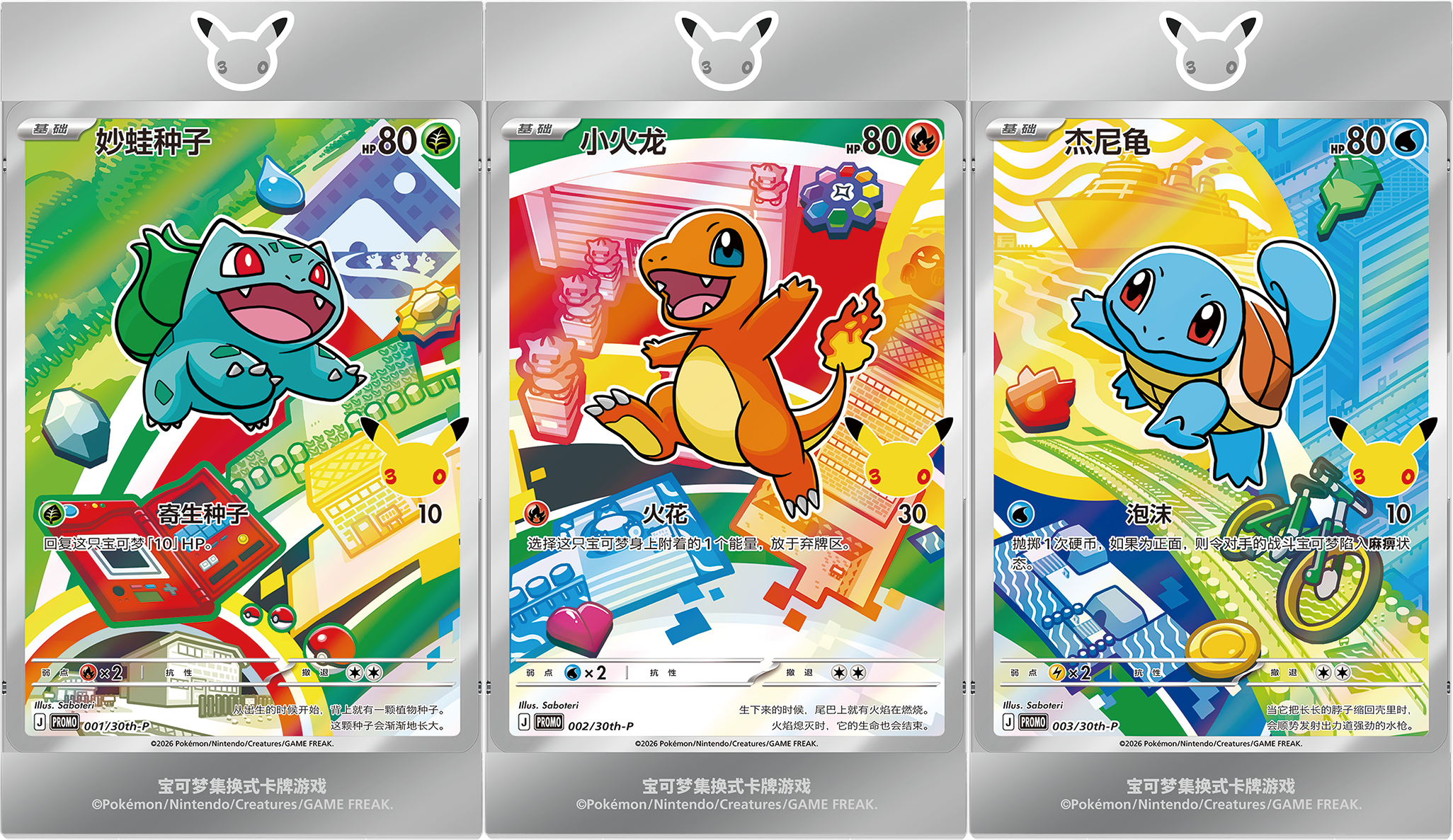 2026年是宝可梦诞生的30周年。在这欢庆之年,“30周年庆典 最初的伙伴特别插画闪卡套装 Vol.1”将于3月20日与广大训练家率先见面。套装内含1张最初的伙伴特别插画闪卡,1个亚克力磁吸卡牌展示框和1包“璀璨诡幻”补充包(5张装)。和宝可梦一路同行的大家,与最初的伙伴共同享受这个欢聚时刻吧。