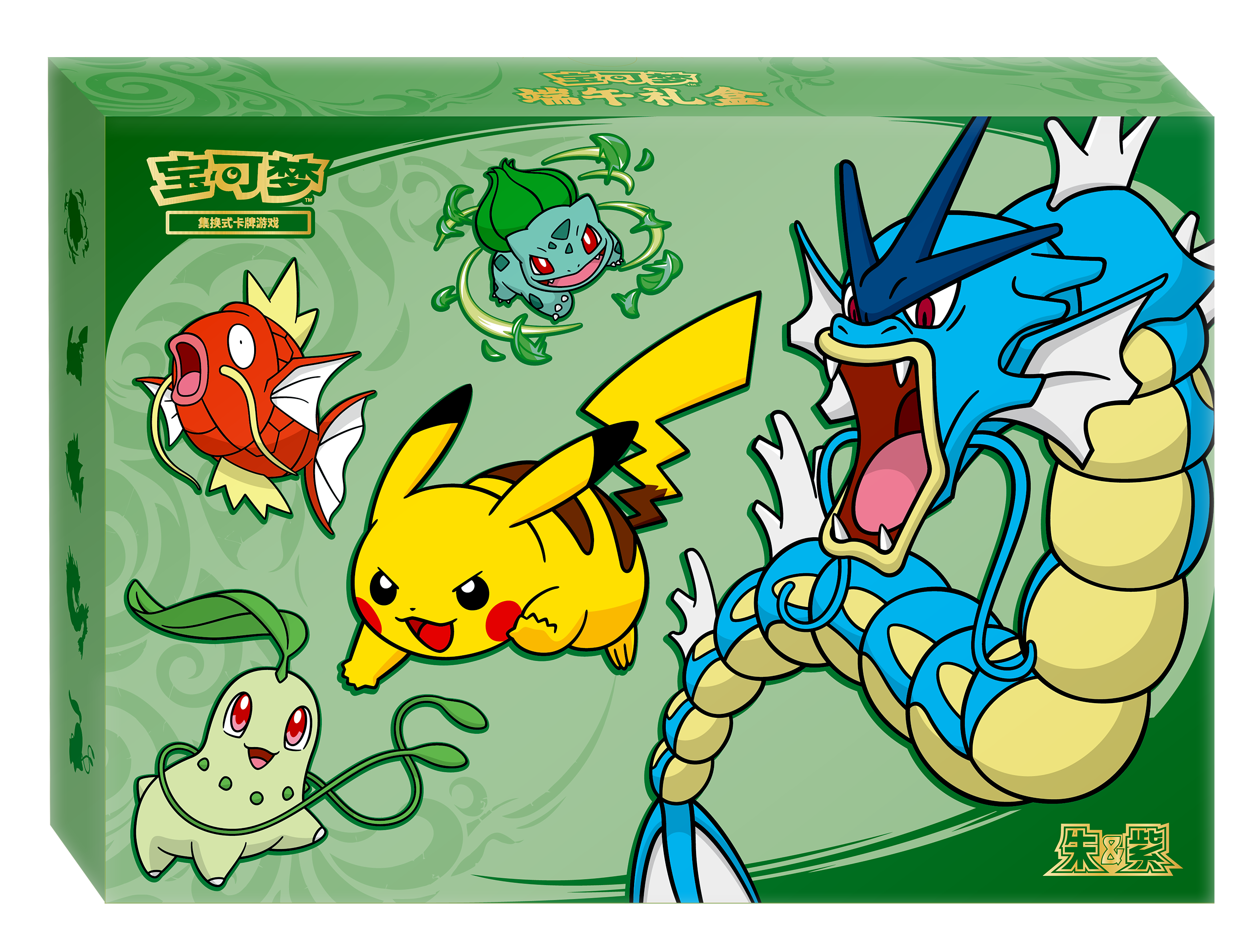 2026端午礼盒的外盒通体采用艾草和粽叶般的翠绿色,营造了浓浓的端午氛围。皮卡丘、暴鲤龙、妙蛙种子、鲤鱼王和菊草叶齐聚于画面之上,伴你共度端午佳节。