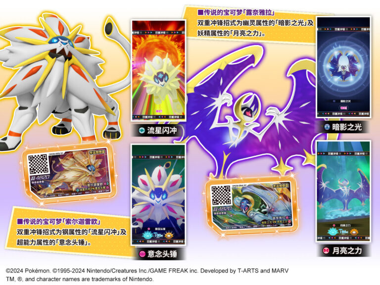 此外,还有可使用Z招式的“凤王”“洛奇亚”与可使用冲锋连击的“大竺葵”“火暴兽”“大力鳄”等多数宝可梦于本弹中登场!高人气的“皮卡丘”以及传说的宝可梦“索尔加雷欧”“露奈雅拉”等共13张全新的“群星幸运加傲盘”等你收藏!